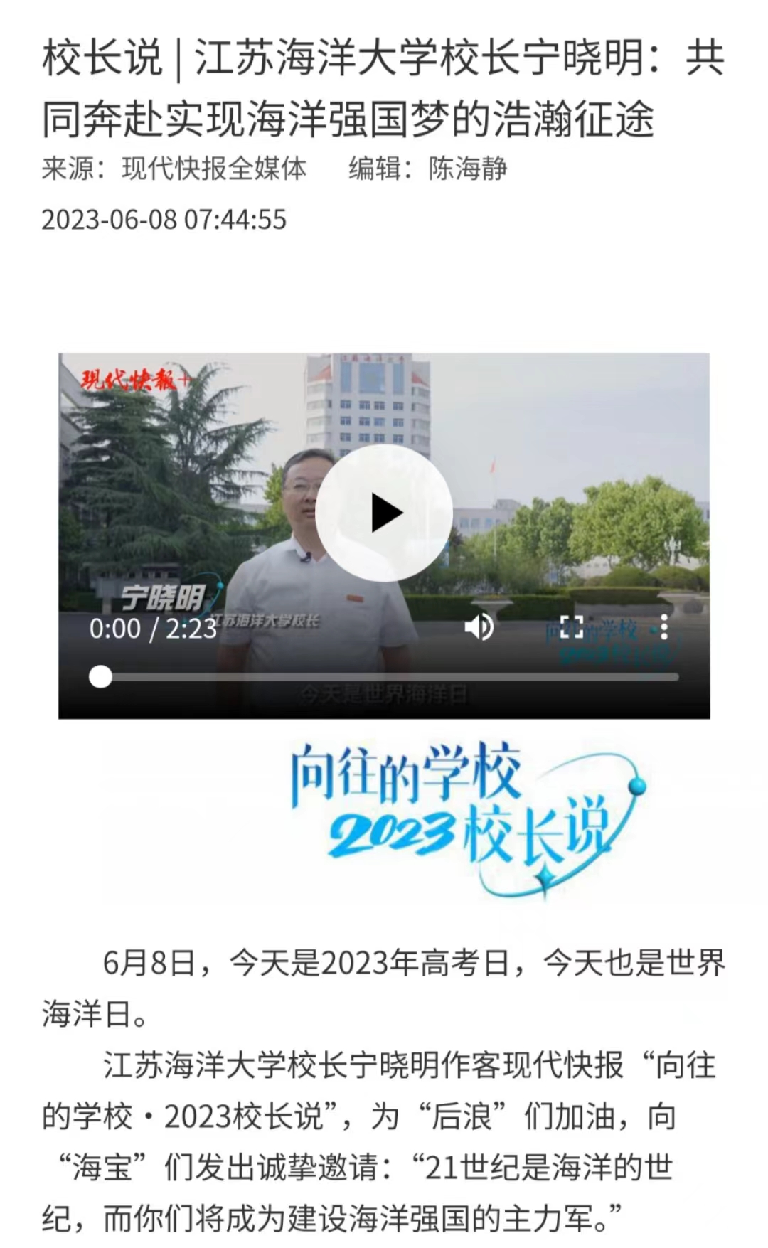 江苏海洋大学校长宁晓明作客现代快报“向往的学校· 2023校长说”,为“后浪”们加油,向“海宝”们发出诚挚邀请:“ 21世纪是海洋的世纪,而你们将成为建设海洋强国的主力军。”