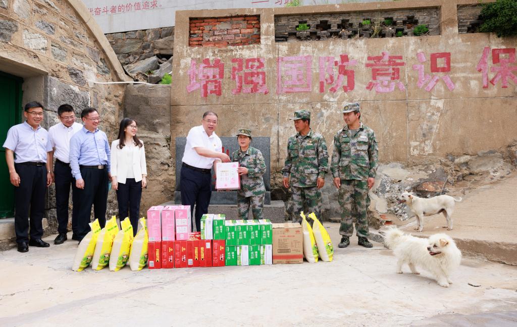 “你们守岛辛苦了,我代表江苏海洋大学的师生来看望大家……”一登上岛,校党委书记王自力第一时间看望慰问了王仕花及守岛民兵,送上牛奶、大米、食用油等生活物资。