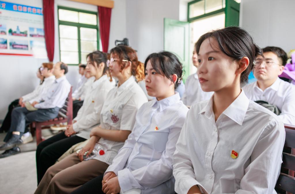 “我志愿加入中国共产党,拥护党的纲领,遵守党的章程……”在开山岛最高处的国旗广场上,全体党员师生整齐列队、庄严肃立,进行新党员入党宣誓,到场的所有党员同志一起重温入党誓词。