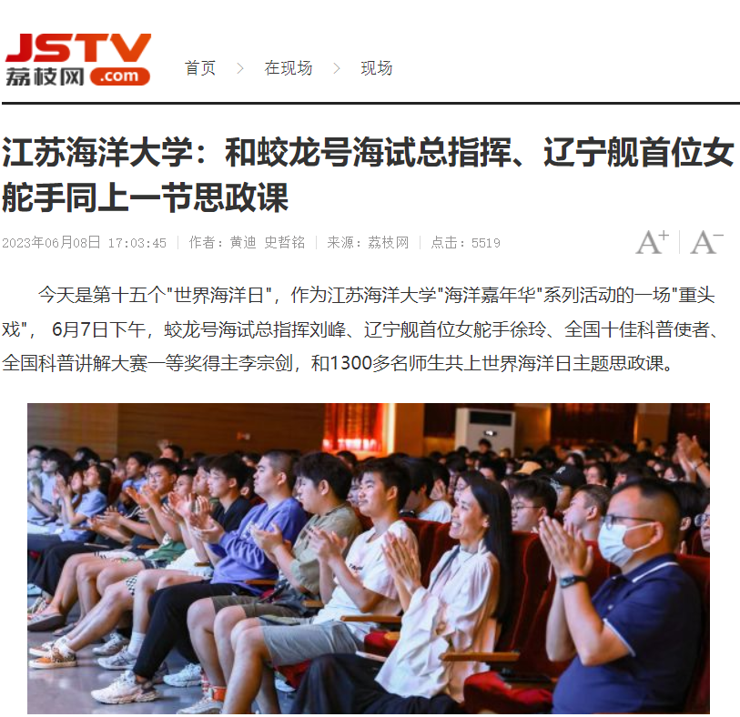 今天是第十五个"世界海洋日",作为江苏海洋大学"海洋嘉年华"系列活动的一场"重头戏",6月7日下午,蛟龙号海试总指挥刘峰、辽宁舰首位女舵手徐玲、全国十佳科普使者、全国科普讲解大赛一等奖得主李宗剑,和1300多名师生共上世界海洋日主题思政课。