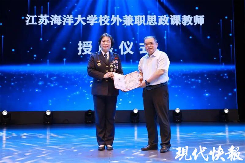 江苏海洋大学党委书记王自力为徐玲颁发"校外兼职思政课教师"聘书