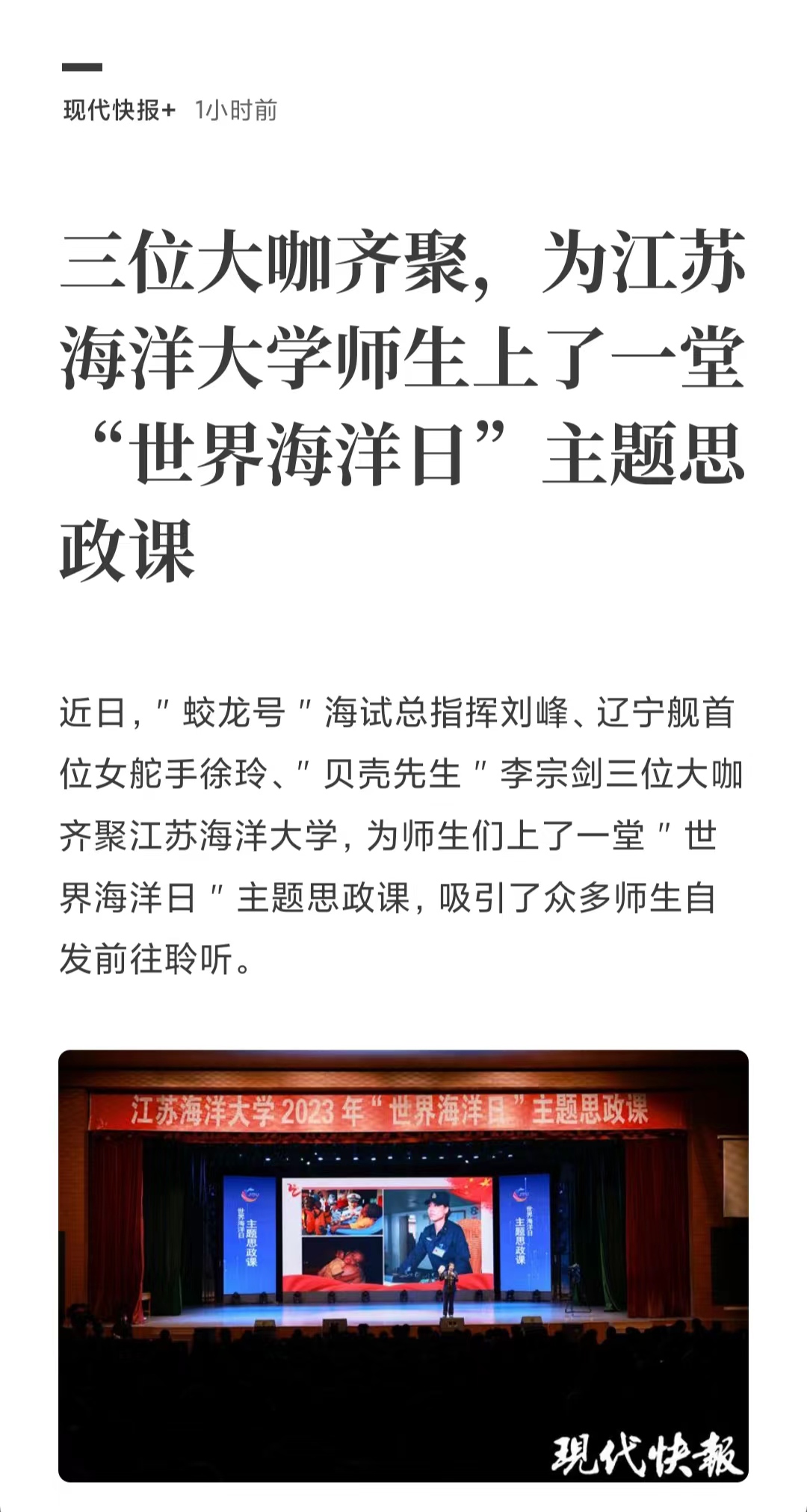 近日,"蛟龙号"海试总指挥刘峰、辽宁舰首位女舵手徐玲、"贝壳先生"李宗剑三位大咖齐聚江苏海洋大学,为师生们上了一堂"世界海洋日"主题思政课,吸引了众多师生自发前往聆听。