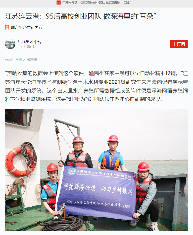 2019年,该团队在水产养殖合作社进行暑期社会实践的过程中,听到当地渔民抱怨:“往网箱里投饲料时很难把控数量,投少了鱼儿吃不饱,投多了污染水质,鱼儿又容易得病。”当时,我国市场多采用水下光学设备对投饲量进行监测,但运用于深海时,光线暗、海水浊、海浪大等问题,让光学设备无法精准“定量定位”地监测投饲量。江苏海洋大学团队成员尝试了多种解决方案,都因成本过高或难以实现而被否决,指导老师江苏海洋大学海洋技术与测绘学院院长孙佳龙提议:“要不试试声呐监测?”
