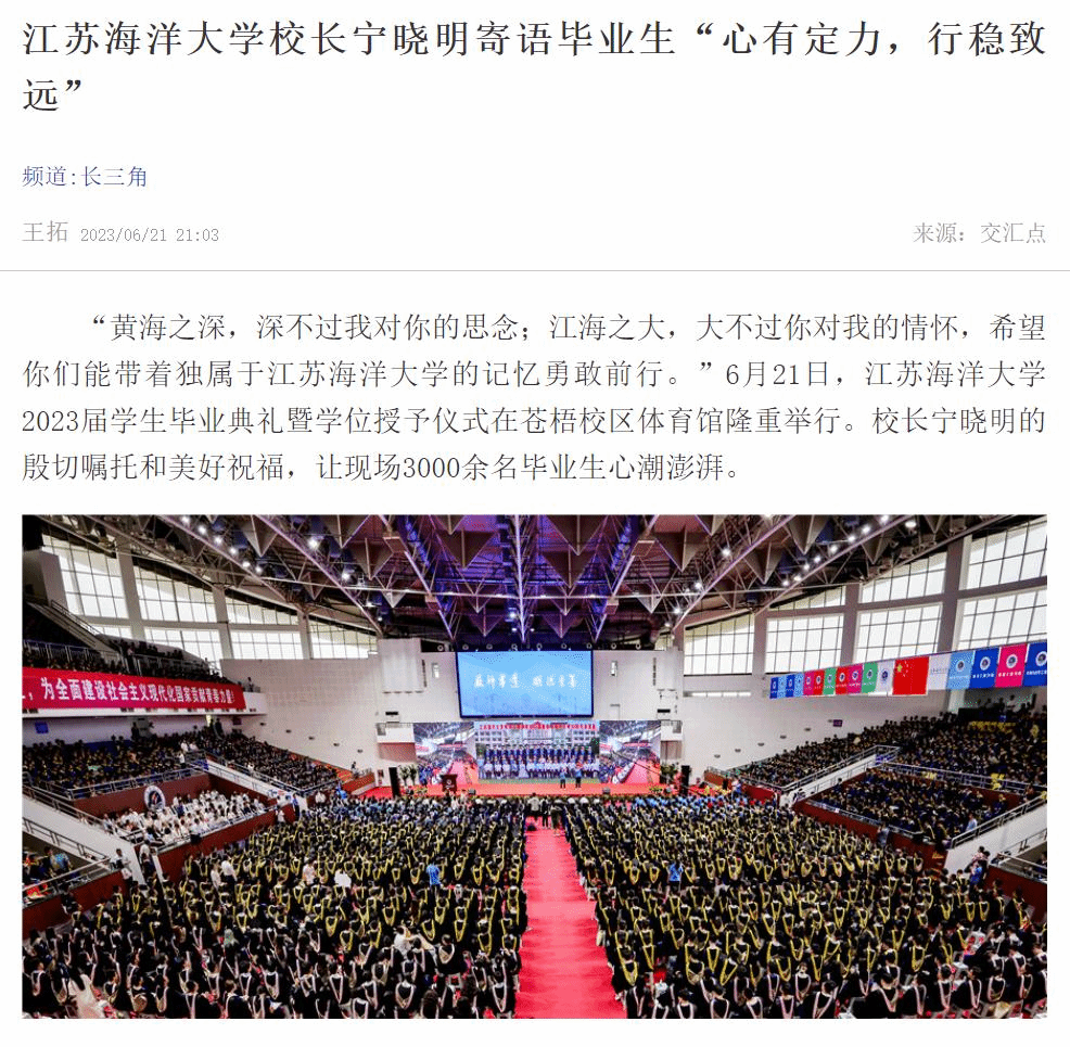 “黄海之深,深不过我对你的思念;江海之大,大不过你对我的情怀,希望你们能带着独属于江苏海洋大学的记忆勇敢前行。”6月21日,江苏海洋大学2023届学生毕业典礼暨学位授予仪式在苍梧校区体育馆隆重举行。校长宁晓明的殷切嘱托和美好祝福,让现场3000余名毕业生心潮澎湃。