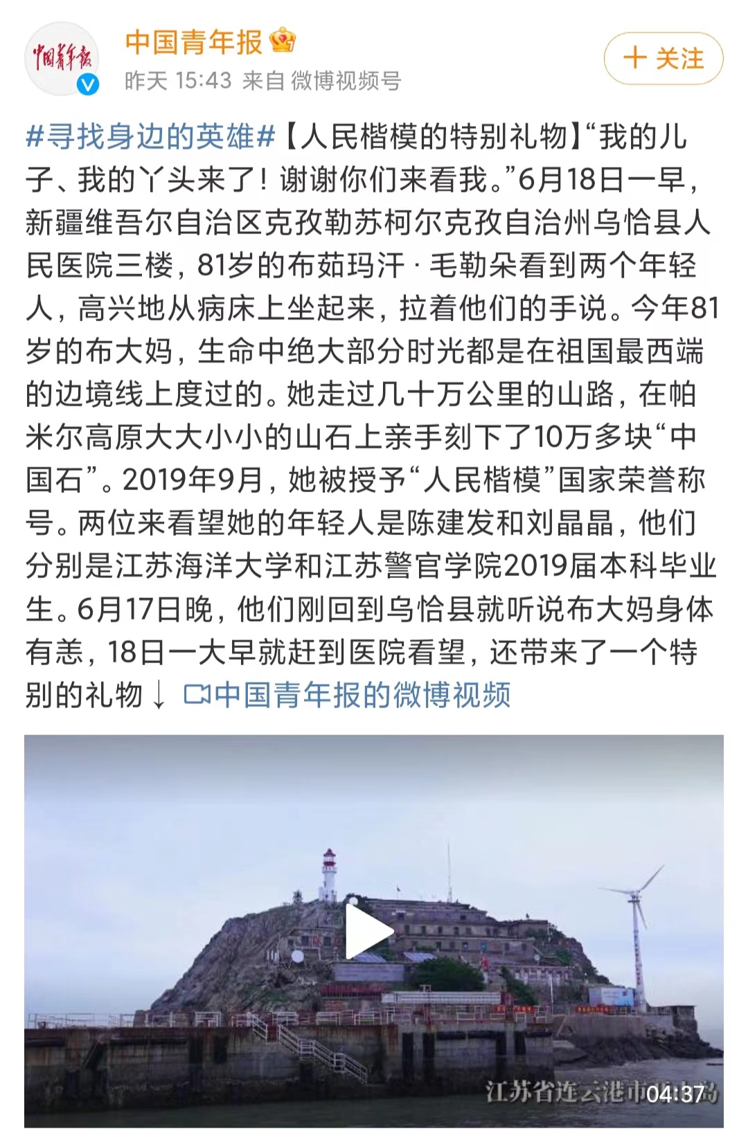 “我的儿子、我的丫头来了!谢谢你们来看我。”6月18日一早,新疆维吾尔自治区克孜勒苏柯尔克孜自治州乌恰县人民医院三楼,81岁的布茹玛汗·毛勒朵看到两个年轻人,高兴地从病床上坐起来,拉着他们的手说。今年81岁的布大妈,生命中绝大部分时光都是在祖国最西端的边境线上度过的。她走过几十万公里的山路,在帕米尔高原大大小小的山石上亲手刻下了10万多块“中国石”。2019年9月,她被授予“人民楷模”国家荣誉称号。两位来看望她的年轻人是陈建发和刘晶晶,他们分别是江苏海洋大学和江苏警官学院2019届本科毕业生。6月17日晚,他们刚回到乌恰县就听说布大妈身体有恙,18日一大早就赶到医院看望,还带来了一个特别的礼物。