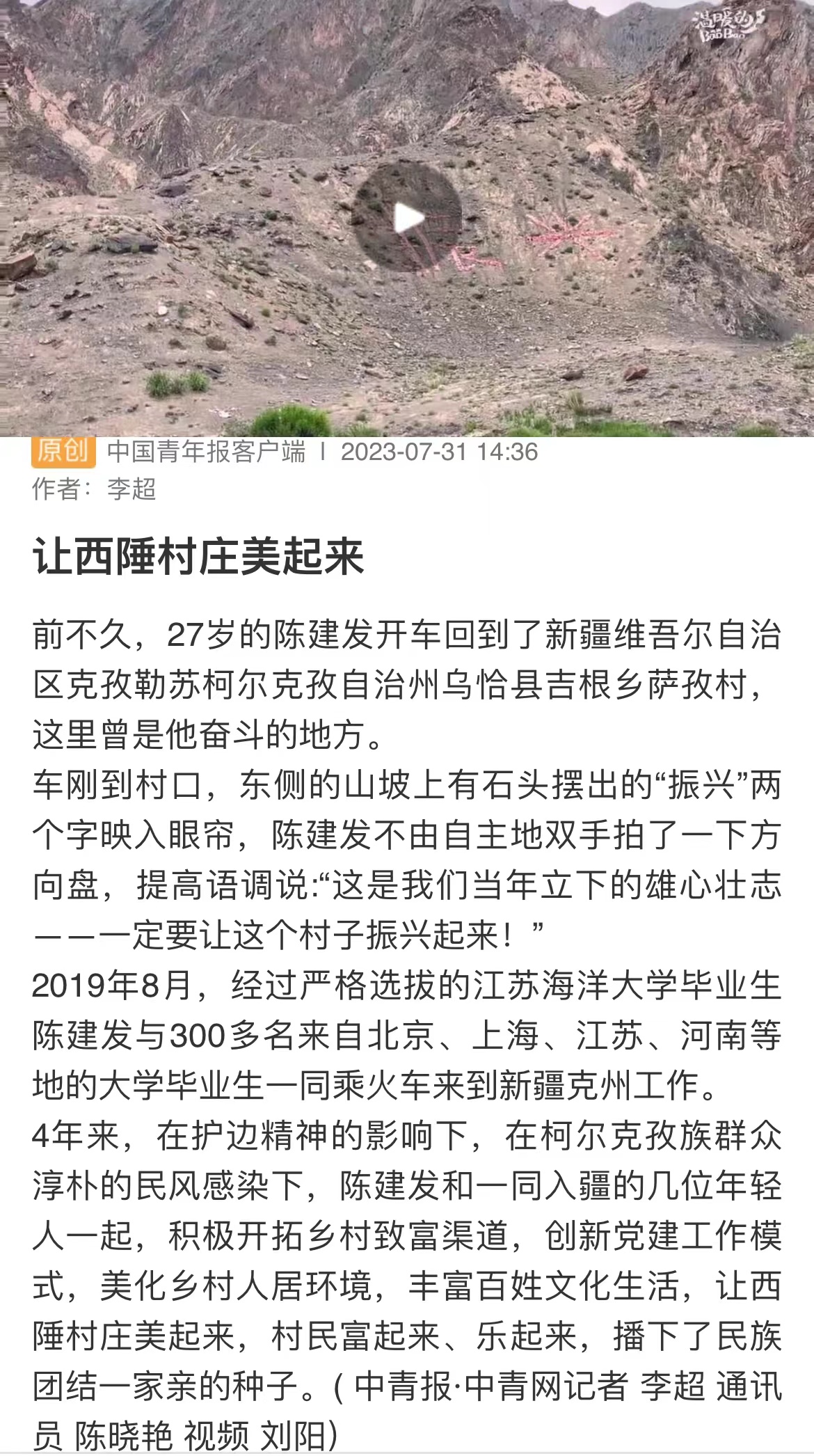 前不久,27岁的陈建发开车回到了新疆维吾尔自治区克孜勒苏柯尔克孜自治州乌恰县吉根乡萨孜村,这里曾是他奋斗的地方。 车刚到村口,东侧的山坡上有石头摆出的“振兴”两个字映入眼帘,陈建发不由自主地双手拍了一下方向盘,提高语调说:“这是我们当年立下的雄心壮志——一定要让这个村子振兴起来!” 2019年8月,经过严格选拔的江苏海洋大学毕业生陈建发与300多名来自北京、上海、江苏、河南等地的大学毕业生一同乘火车来到新疆克州工作。4年来,在护边精神的影响下,在柯尔克孜族群众淳朴的民风感染下,陈建发和一同入疆的几位年轻人一起,积极开拓乡村致富渠道,创新党建工作模式,美化乡村人居环境,丰富百姓文化生活,让西陲村庄美起来,村民富起来、乐起来,播下了民族团结一家亲的种子。(通讯员:陈晓艳)