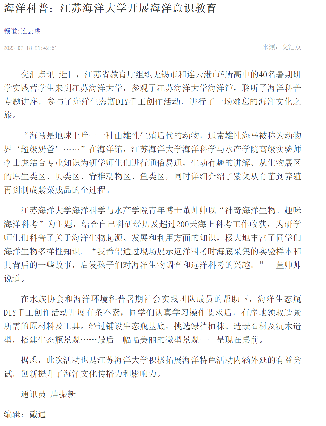 近日,江苏省教育厅组织无锡市和连云港市8所高中的40名暑期研学实践营学生来到江苏海洋大学,参观了江苏海洋大学海洋馆,聆听了海洋科普专题讲座,参与了海洋生态瓶DIY手工创作活动,进行了一场难忘的海洋文化之旅。