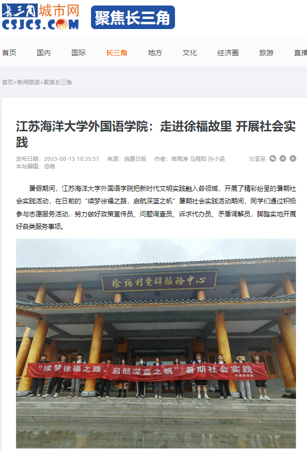 暑假期间,江苏海洋大学外国语学院把新时代文明实践融入各领域,开展了精彩纷呈的暑期社会实践活动,在日前的“续梦徐福之路,启航深蓝之帆”暑期社会实践活动期间,同学们通过积极参与志愿服务活动,努力做好政策宣传员、问题调查员、诉求代办员、矛盾调解员,脚踏实地开展好各类服务事项。