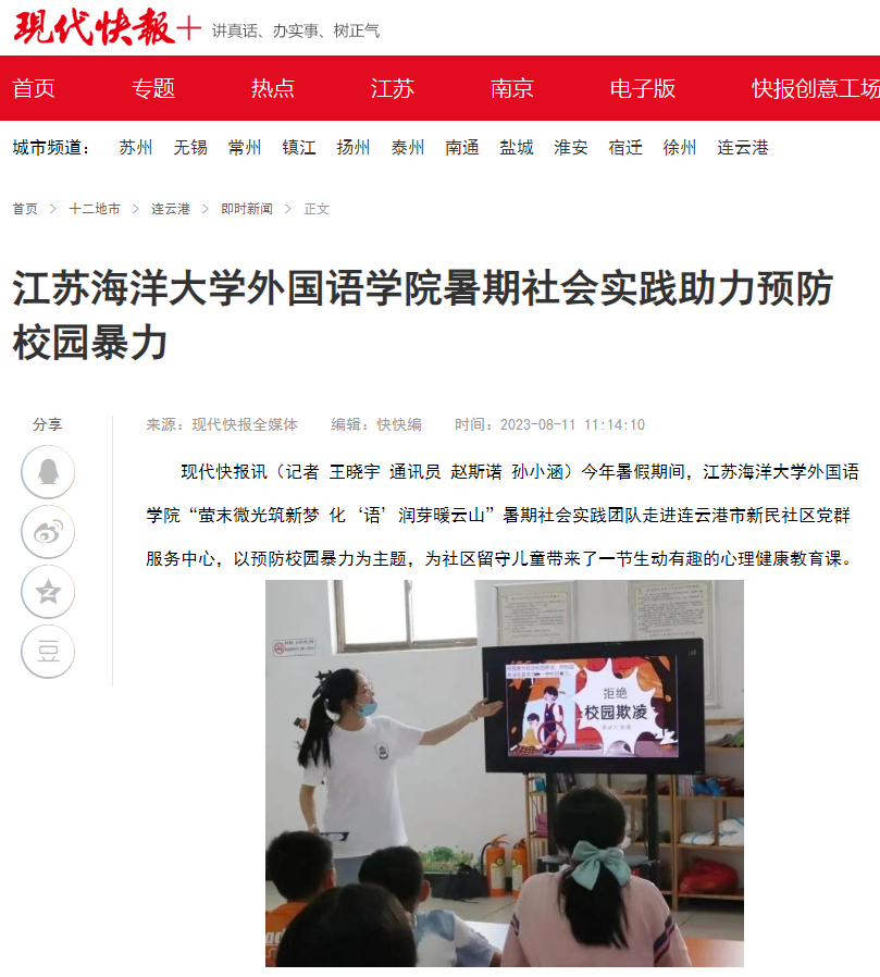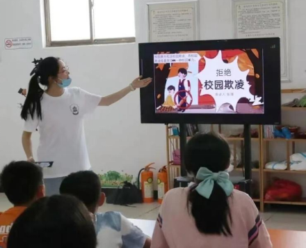 今年暑假期间,江苏海洋大学外国语学院“萤末微光筑新梦 化‘语’润芽暖云山”暑期社会实践团队走进连云港市新民社区党群服务中心,以预防校园暴力为主题,为社区留守儿童带来了一节生动有趣的心理健康教育课。