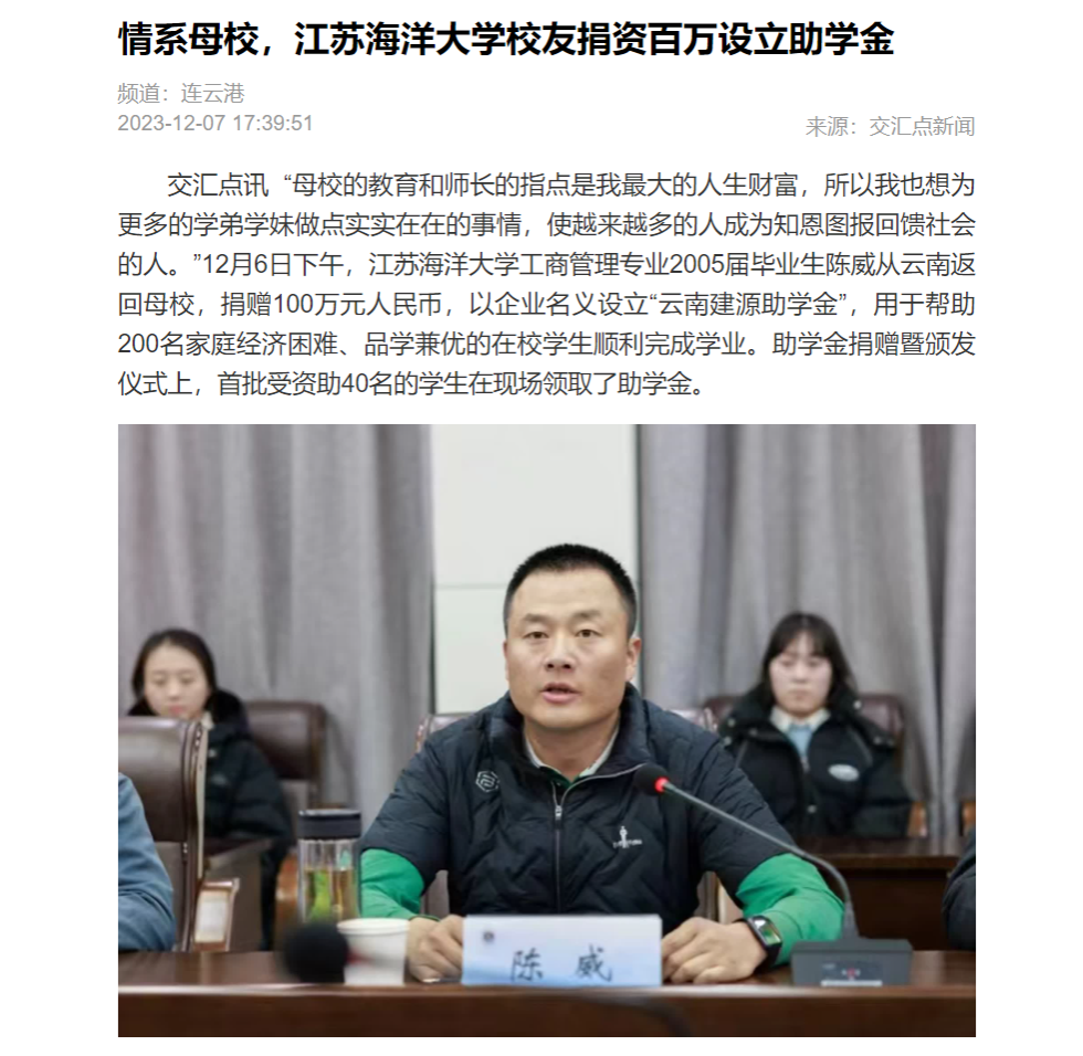 “母校的教育和师长的指点是我最大的人生财富,所以我也想为更多的学弟学妹做点实实在在的事情,使越来越多的人成为知恩图报回馈社会的人。”12月6日下午,江苏海洋大学工商管理专业2005届毕业生陈威从云南返回母校,捐赠100万元人民币,以企业名义设立“云南建源助学金”,用于帮助200名家庭经济困难、品学兼优的在校学生顺利完成学业。助学金捐赠暨颁发仪式上,首批受资助40名的学生在现场领取了助学金。
