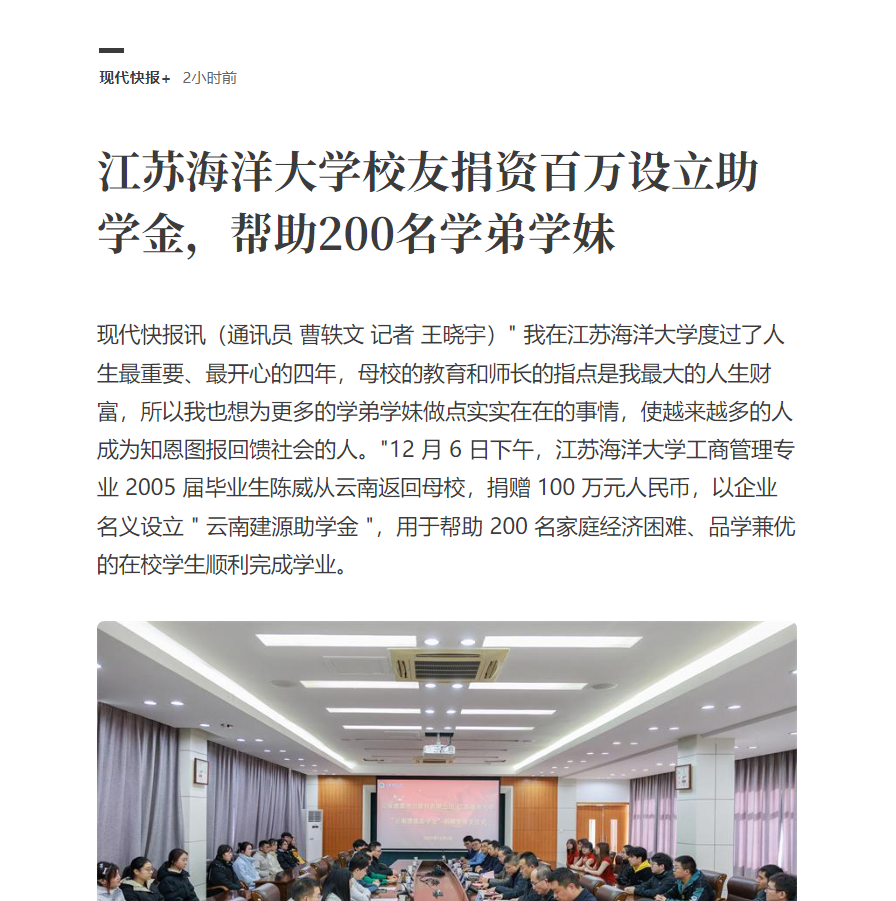 " 我在江苏海洋大学度过了人生最重要、最开心的四年,母校的教育和师长的指点是我最大的人生财富,所以我也想为更多的学弟学妹做点实实在在的事情,使越来越多的人成为知恩图报回馈社会的人。"12 月 6 日下午,江苏海洋大学工商管理专业 2005 届毕业生陈威从云南返回母校,捐赠 100 万元人民币,以企业名义设立 " 云南建源助学金 ",用于帮助 200 名家庭经济困难、品学兼优的在校学生顺利完成学业。