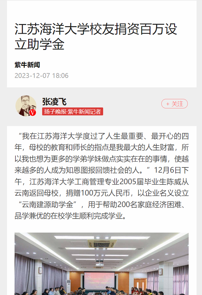 “我在江苏海洋大学度过了人生最重要、最开心的四年,母校的教育和师长的指点是我最大的人生财富,所以我也想为更多的学弟学妹做点实实在在的事情,使越来越多的人成为知恩图报回馈社会的人。”12月6日下午,江苏海洋大学工商管理专业2005届毕业生陈威从云南返回母校,捐赠100万元人民币,以企业名义设立“云南建源助学金”,用于帮助200名家庭经济困难、品学兼优的在校学生顺利完成学业。