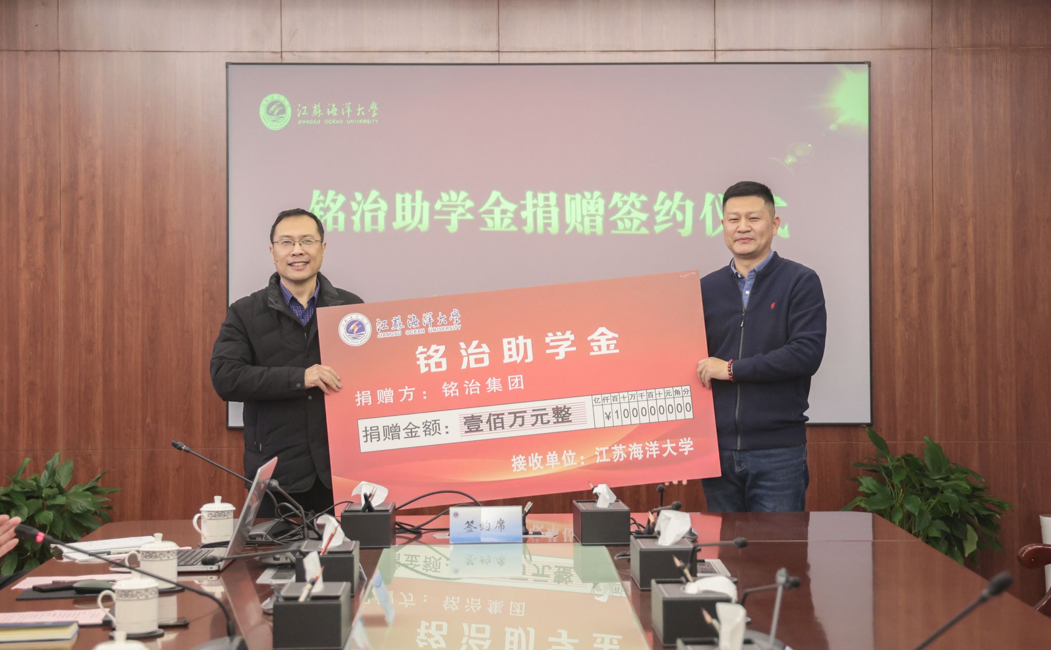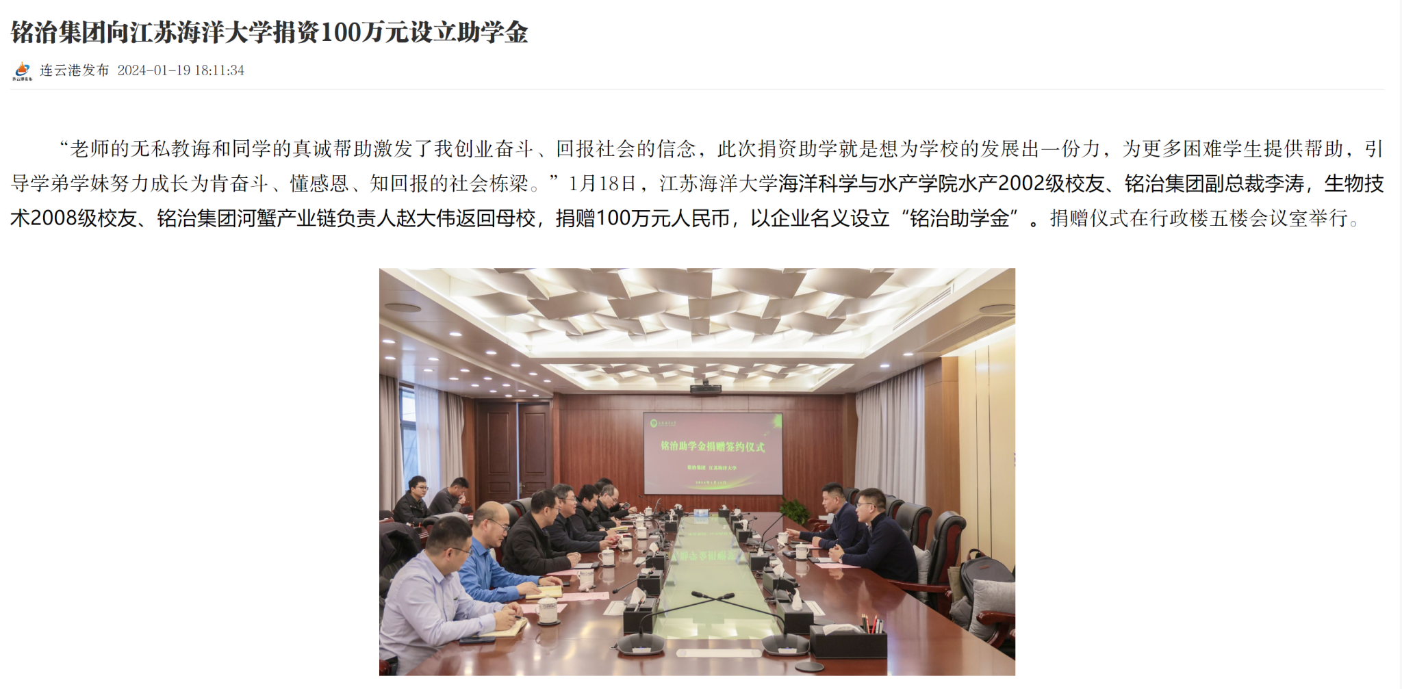 “老师的无私教诲和同学的真诚帮助激发了我创业奋斗、回报社会的信念,此次捐资助学就是想为学校的发展出一份力,为更多困难学生提供帮助,引导学弟学妹努力成长为肯奋斗、懂感恩、知回报的社会栋梁。”1月18日,江苏海洋大学海洋科学与水产学院水产2002级校友、铭治集团副总裁李涛,生物技术2008级校友、铭治集团河蟹产业链负责人赵大伟返回母校,捐赠100万元人民币,以企业名义设立“铭治助学金”。捐赠仪式在行政楼五楼会议室举行。