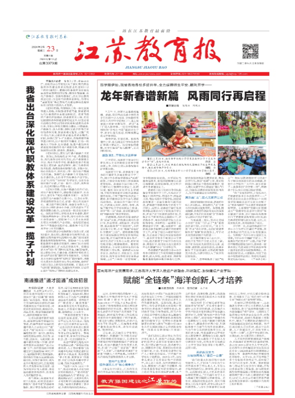 据江苏海洋大学教务处处长安俊丽介绍,近3年,该校依托优势学科专业,组建了生物医药、海洋观测装备、海洋智能装备、数字渔业等13个产业学院,其中“生物医药产业学院”入选省级重点产业学院,“新型电子封装材料产业学院”入选工信部专精特新产业学院。该校获批6个省级产教融合品牌专业,获批数位列全省高校第四。此外,江苏海洋大学还出台产业学院管理办法,建立行业企业深度参与学校专业建设和人才培养的新机制,推动“创新链”“教育链”和“产业链”有效链接。