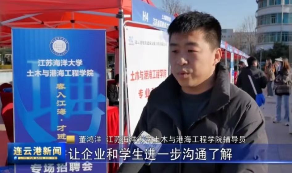 董鸿洋 江苏海洋大学土木与港海工程学院辅导员:我们主要是吸引更多的企业来提供这种专业对口的模式来更多的吸引学生前来就业,扩大就业岗位。目前我们了解到的情况,现在已经向现场签约的只有三个学生,有就业意向的已经有十几个学生,今天晚上还会举办各个企业的一个专场的宣讲会,让企业和学生的进一步沟通了解。