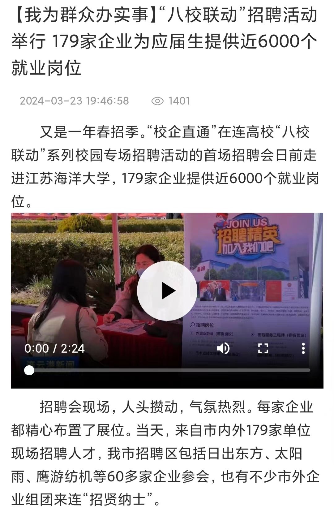 又是一年春招季。“校企直通”在连高校“八校联动”系列校园专场招聘活动的首场招聘会日前走进江苏海洋大学,179家企业提供近6000个就业岗位。