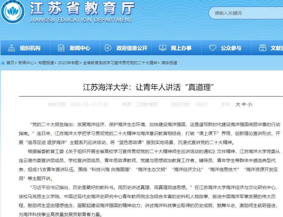 据江苏海洋大学党委常委、宣传部部长杨雪英介绍,该校组织专家学者针对巡讲主题、巡讲讲稿、表达表现形式等方面,对巡讲团成员集体备课备讲进行指导。巡讲团成员依托“蓝色接力讲”思政课堂、“一站式”学生社区、主题党团日、讲座讲堂等渠道,采取报告会、座谈会、分享会、演讲等形式,深刻阐述党的二十大的思想内涵、战略部署、行动指南。宣讲视频在学校各级网站、官微、官博、视频号等多媒体平台发布后,受到师生广泛好评。