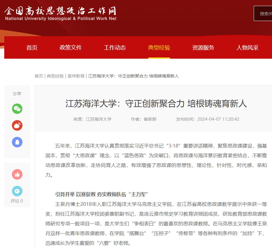 王泉月博士2018年入职江苏海洋大学马克思主义学院,在江苏省高校思政课教学展示中荣获一等奖,担任江苏海洋大学校团委兼职副书记,是连云港市党史学习教育讲师团成员,获批教育部思政课教师研究专项一般项目一项,是大学生们“争相表白”的最喜欢的思政课教师。在马克思主义学院像王泉月这样一批青年思政课教师,在学院“搭舞台”“压担子”“传帮带”等各种有利条件的“加持”下,迅速成长为学生喜爱的“六要”好老师。