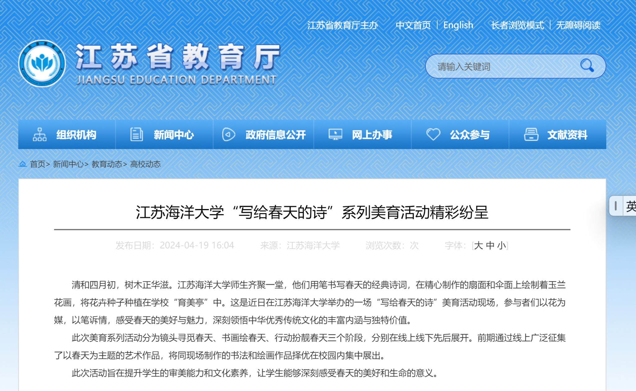 清和四月初,树木正华滋。江苏海洋大学师生齐聚一堂,他们用笔书写春天的经典诗词,在精心制作的扇面和伞面上绘制着玉兰花画,将花卉种子种植在学校“育美亭”中。这是近日在江苏海洋大学举办的一场“写给春天的诗”美育活动现场,参与者们以花为媒,以笔诉情,感受春天的美好与魅力,深刻领悟中华优秀传统文化的丰富内涵与独特价值。