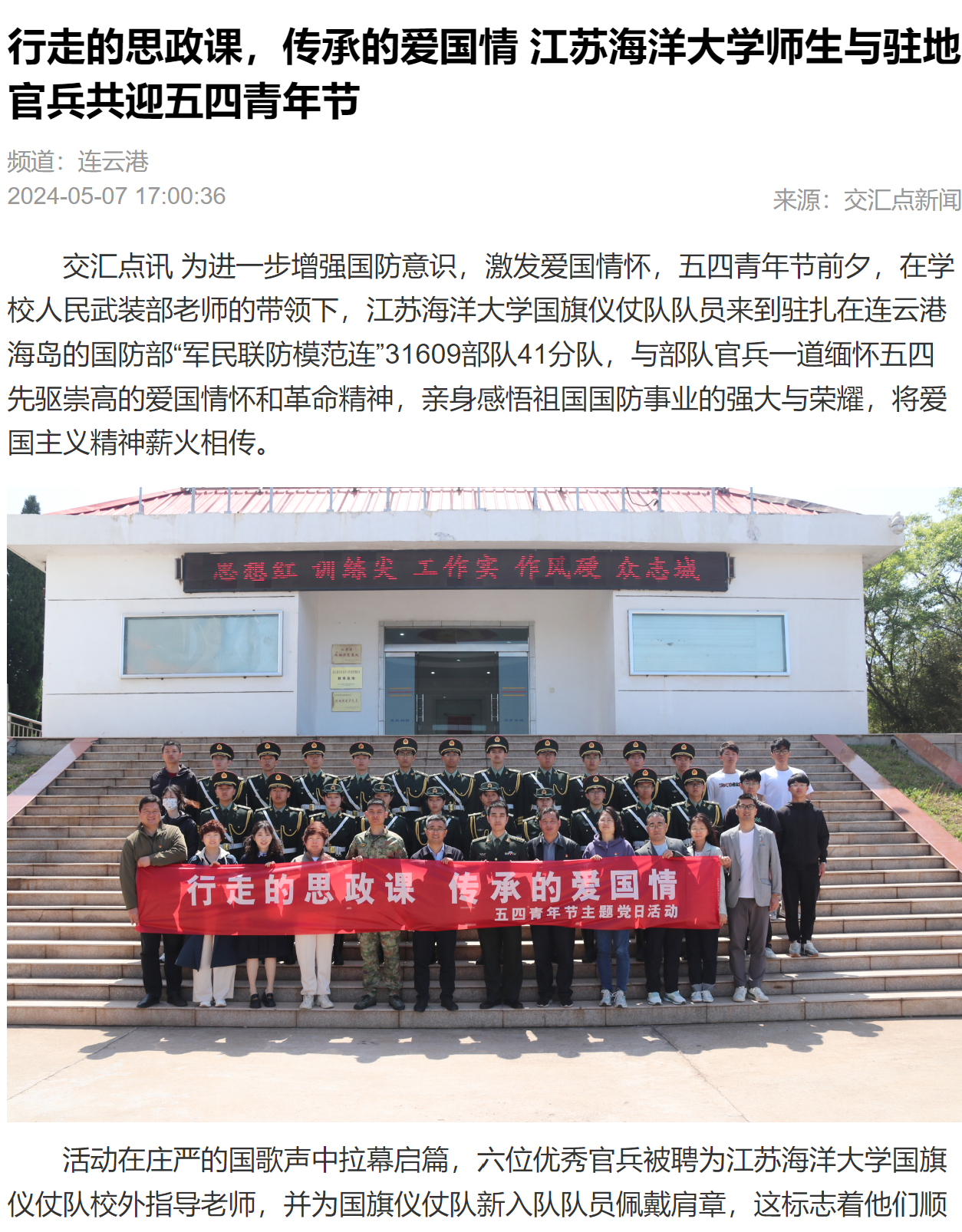 为进一步增强国防意识,激发爱国情怀,五四青年节前夕,在学校人民武装部老师的带领下,江苏海洋大学国旗仪仗队队员来到驻扎在连云港海岛的国防部“军民联防模范连”31609部队41分队,与部队官兵一道缅怀五四先驱崇高的爱国情怀和革命精神,亲身感悟祖国国防事业的强大与荣耀,将爱国主义精神薪火相传。