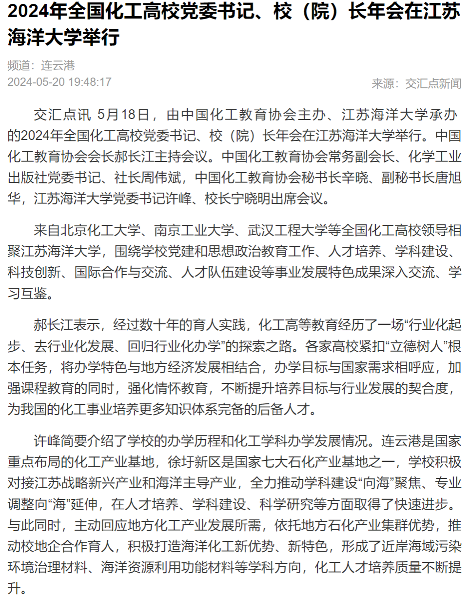 来自北京化工大学、南京工业大学、武汉工程大学等全国化工高校领导相聚江苏海洋大学,围绕学校党建和思想政治教育工作、人才培养、学科建设、科技创新、国际合作与交流、人才队伍建设等事业发展特色成果深入交流、学习互鉴。