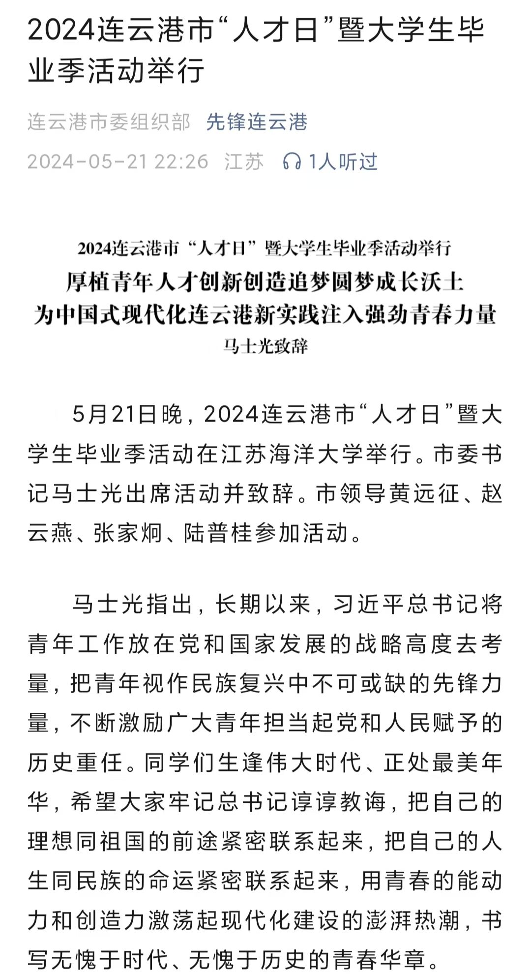 最后,马士光代表市委市政府和530万港城人民,向同学们致以最诚挚的问候和最美好的祝福。他表示,未来不管身处何地,连云港都是广大毕业生的“家”,会一直为大家加油喝彩。