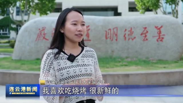 许英玲 江苏海洋大学留学生:连云港这边有很多海鲜,我喜欢吃烧烤,我也喜欢连云港这里的天气,能看到蓝蓝的天空、白白的云。我非常喜欢这里的天气,因为在我的国家印度尼西亚只有两个季节。在中国我们我体验了四个季节,还有去年,我第一次体验了冬天。
