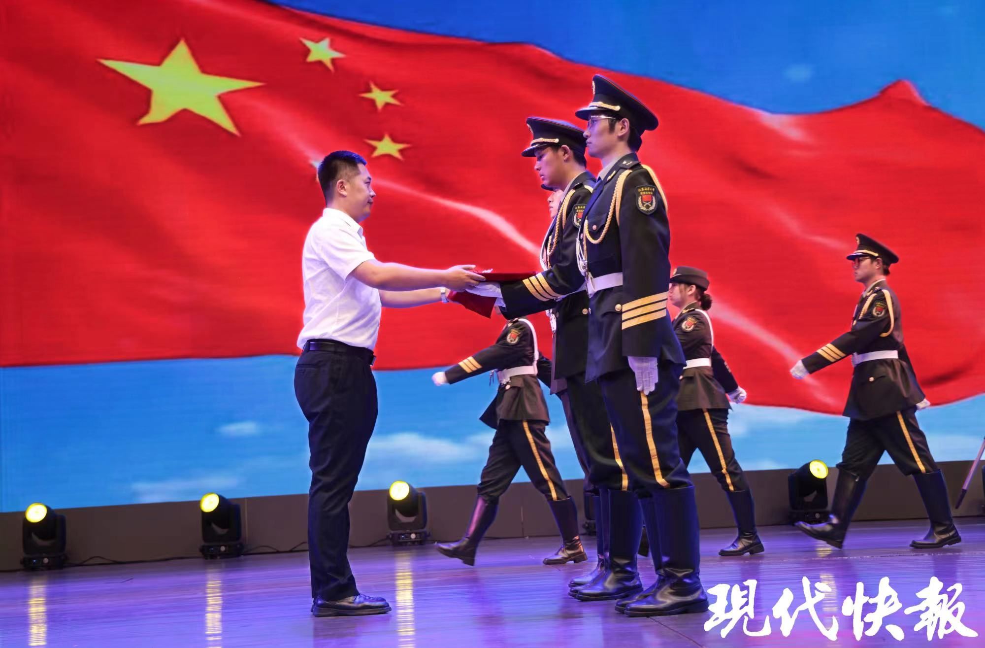 国旗仪仗队接过这面珍贵的国旗,全场师生共同高唱《歌唱祖国》,嘹亮歌声响彻礼堂。