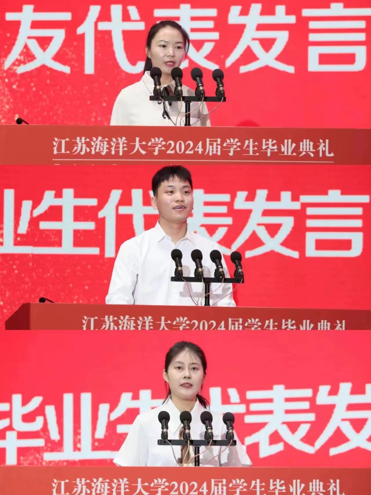 校友代表、全国五一劳动奖章获得者、海洋科学与水产学院毕业生徐梦雪发言。她一直致力于水产绿色生态养殖技术示范与推广工作,在河蟹全产业链发展、海蜇育苗、水生生物疫病监测防控、条斑紫菜种苗高效培育技术及良种示范推广工作上做出一定的成绩和影响。她号召毕业生们要铭记母校的教诲和老师的嘱托,在未来的岁月里,既要有仰望星空的志向,也不失脚踏实地的坚韧。