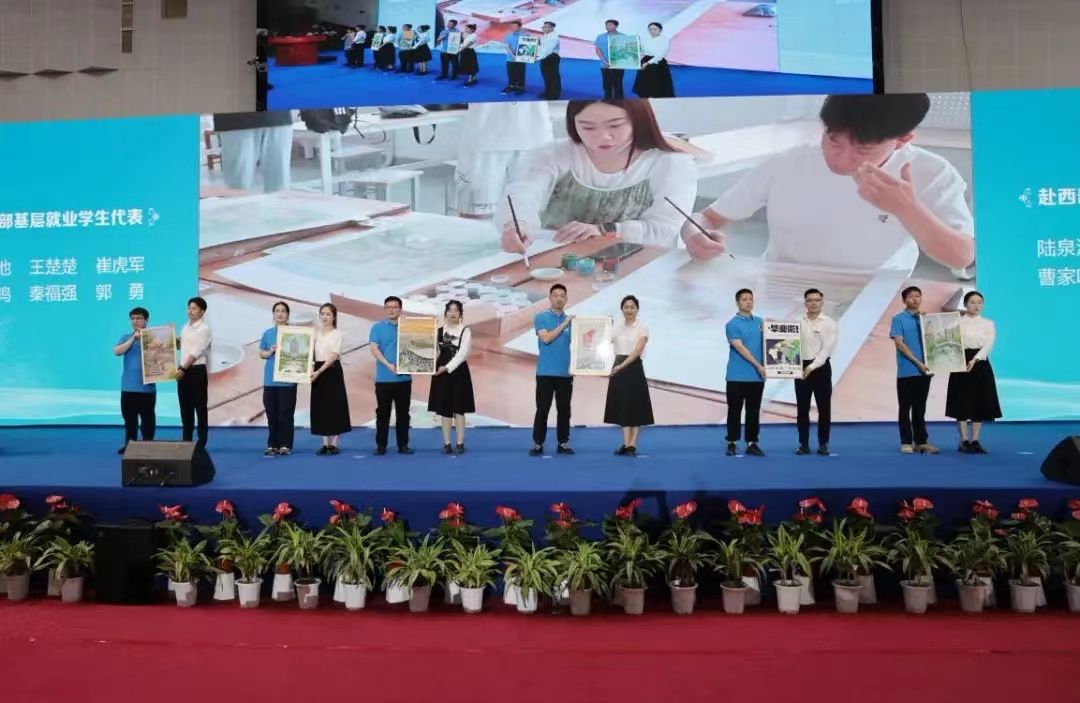 教师代表向赴西部基层就业学生代表赠送纪念品。
