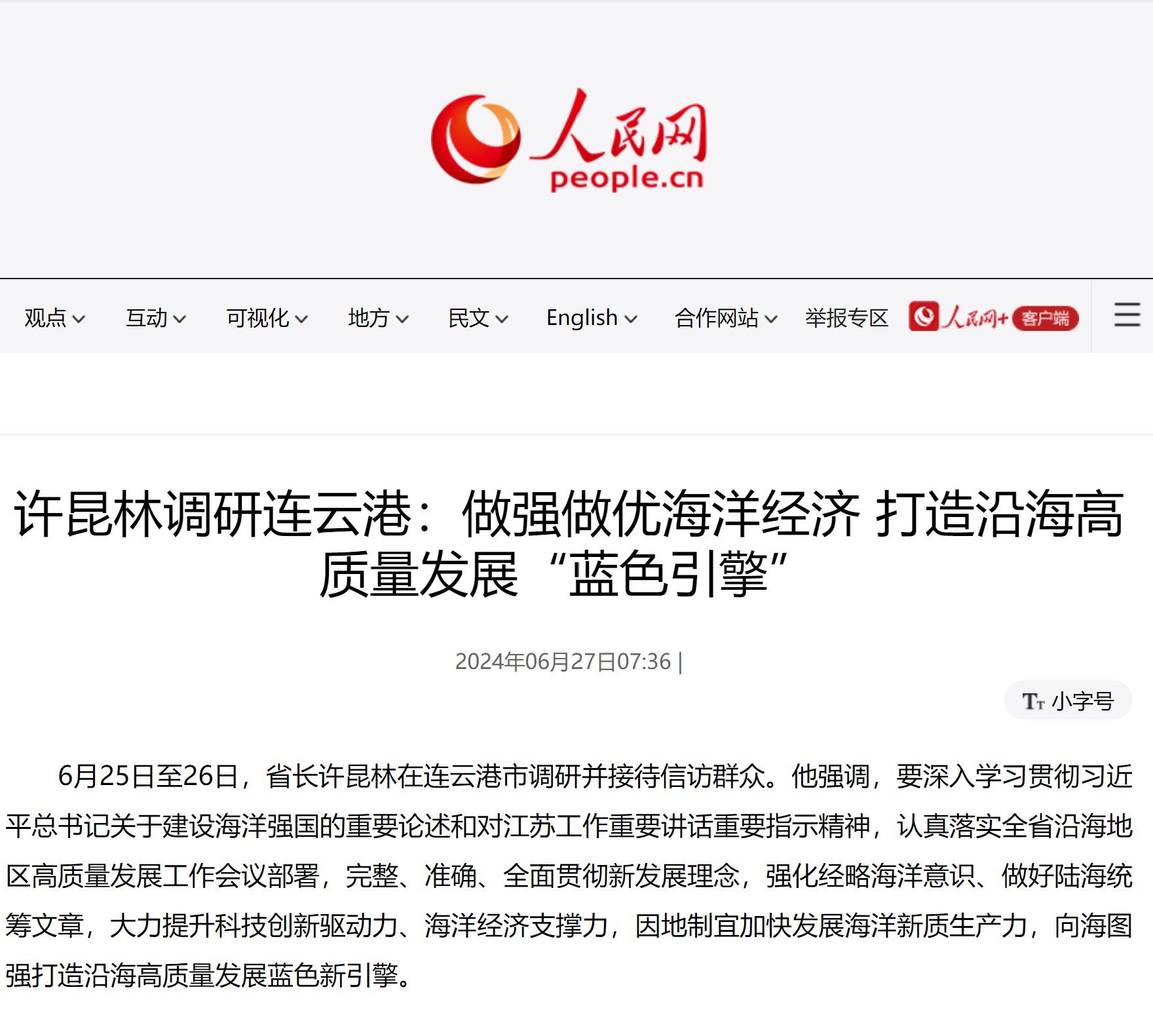 6月25日至26日,省长许昆林在连云港市调研并接待信访群众。他强调,要深入学习贯彻习近平总书记关于建设海洋强国的重要论述和对江苏工作重要讲话重要指示精神,认真落实全省沿海地区高质量发展工作会议部署,完整、准确、全面贯彻新发展理念,强化经略海洋意识、做好陆海统筹文章,大力提升科技创新驱动力、海洋经济支撑力,因地制宜加快发展海洋新质生产力,向海图强打造沿海高质量发展蓝色新引擎。