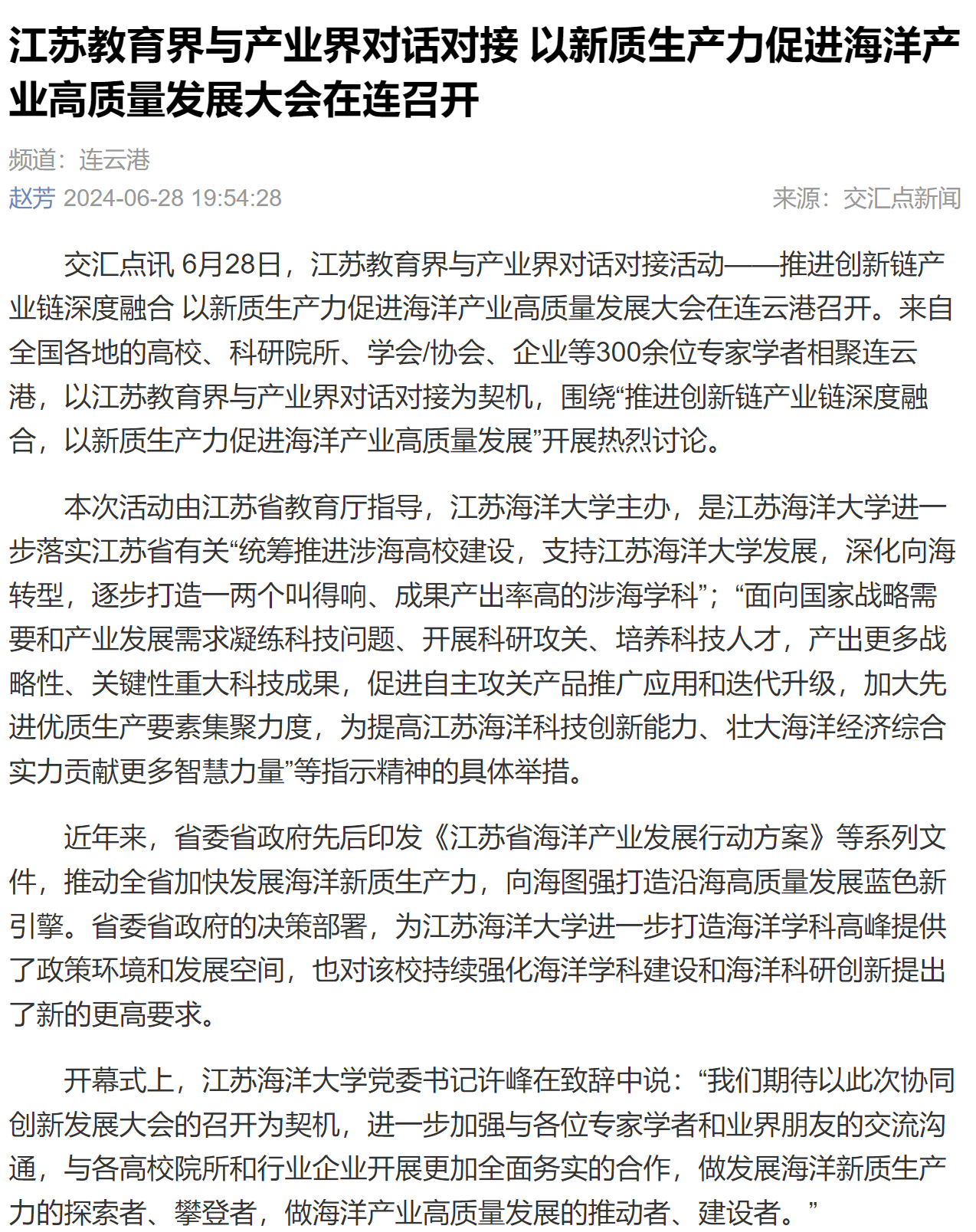 6月28日,江苏教育界与产业界对话对接活动——推进创新链产业链深度融合 以新质生产力促进海洋产业高质量发展大会在连云港召开。来自全国各地的高校、科研院所、学会/协会、企业等300余位专家学者相聚连云港,以江苏教育界与产业界对话对接为契机,围绕“推进创新链产业链深度融合,以新质生产力促进海洋产业高质量发展”开展热烈讨论。