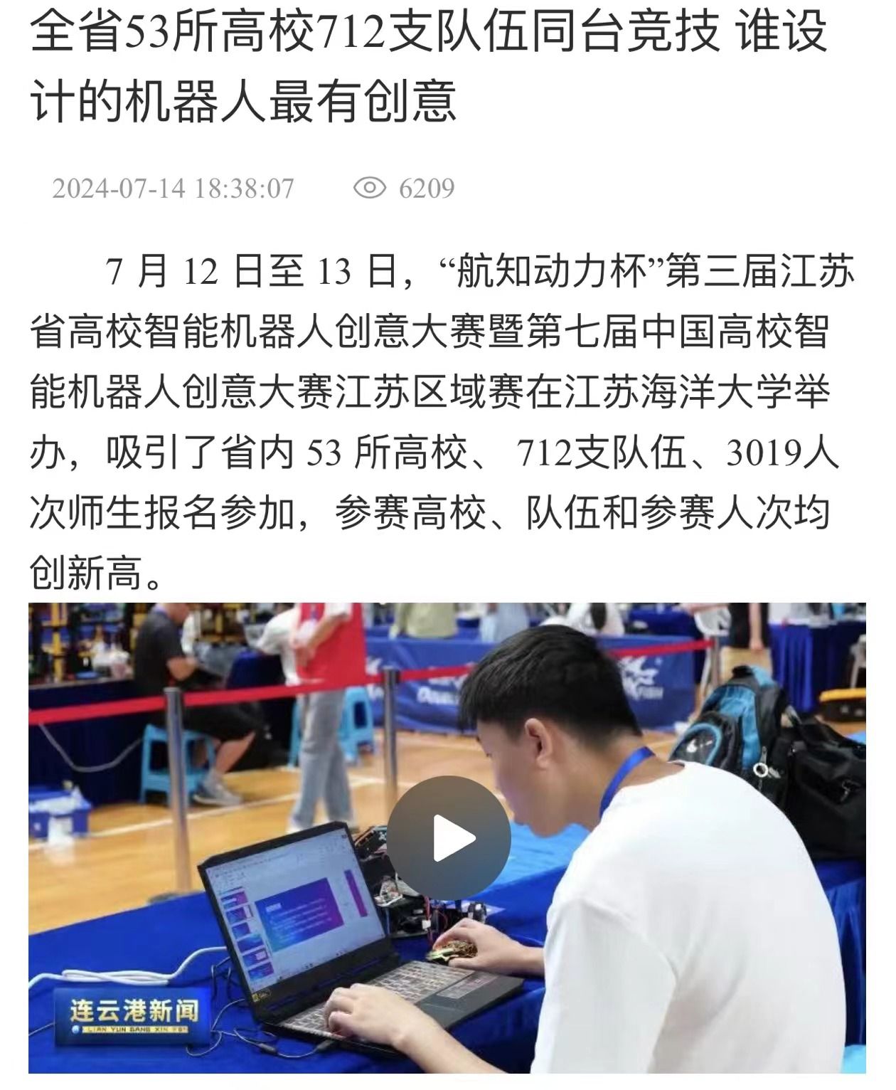 7月12日至13日,“航知动力杯”第三届江苏省高校智能机器人创意大赛暨第七届中国高校智能机器人创意大赛江苏区域赛在江苏海洋大学举办,吸引了省内53所高校、712支队伍、3019人次师生报名参加,参赛高校、队伍和参赛人次均创新高。