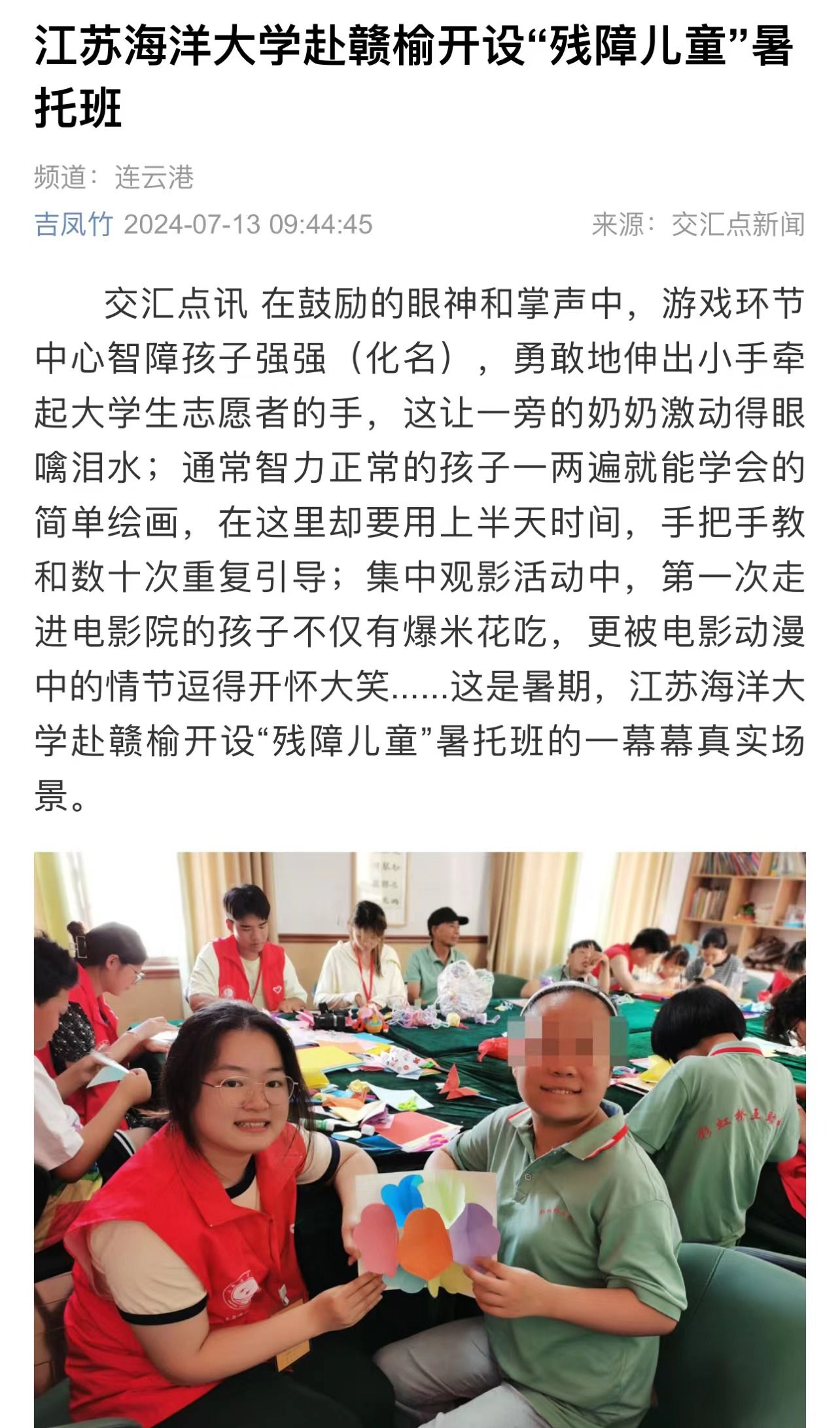在鼓励的眼神和掌声中,游戏环节中心智障孩子强强(化名),勇敢地伸出小手牵起大学生志愿者的手,这让一旁的奶奶激动得眼噙泪水;通常智力正常的孩子一两遍就能学会的简单绘画,在这里却要用上半天时间,手把手教和数十次重复引导;集中观影活动中,第一次走进电影院的孩子不仅有爆米花吃,更被电影动漫中的情节逗得开怀大笑......这是暑期,江苏海洋大学赴赣榆开设“残障儿童”暑托班的一幕幕真实场景。