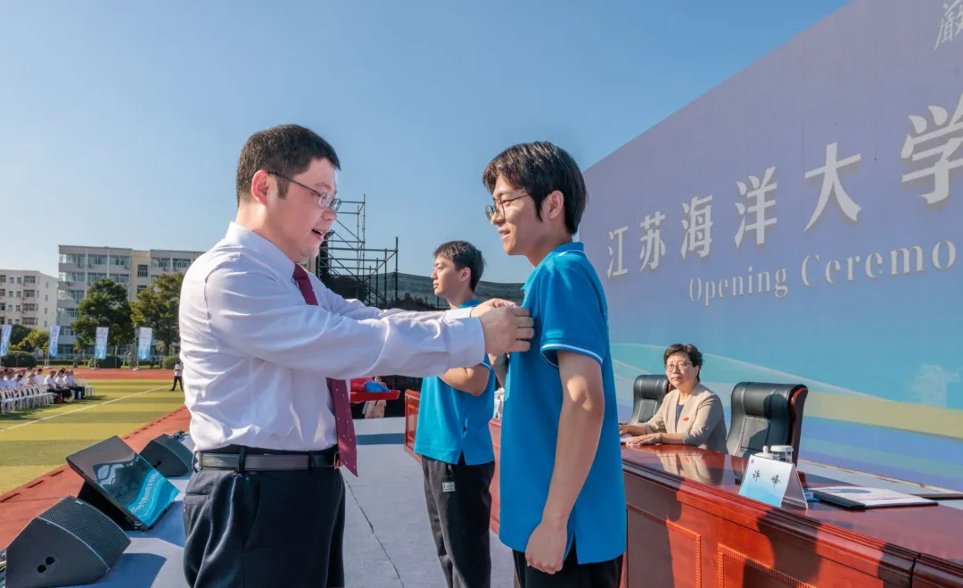 意气风发、踌躇满志的六千余名学子于金秋时节如期而至,共赴山海之约,以踔厉奋发之姿开启人生新航程。典礼上,该校党委书记许峰为本科生及研究生新生代表郑重佩戴上江苏海洋大学校徽,所有在场新生起立同步佩戴校徽,校徽的光辉映照在每位学子胸前。校徽不仅象征着江海大人的身份,更承载着“勤勉自强、敬业奉献、山容海纳、守正求新”的江海大精神。从这一刻起,学子们接过传承江海大精神的接力棒,成为汇聚江海的蓬勃活力,心怀逐梦深蓝之志,共同肩负起强海报国的使命担当。他们以中流击水的胆识力量、勇立潮头的创新精神,将个人成长成才融入国家与时代发展潮流中,让青春之奋斗在百年大变局中绽放青年之光彩。