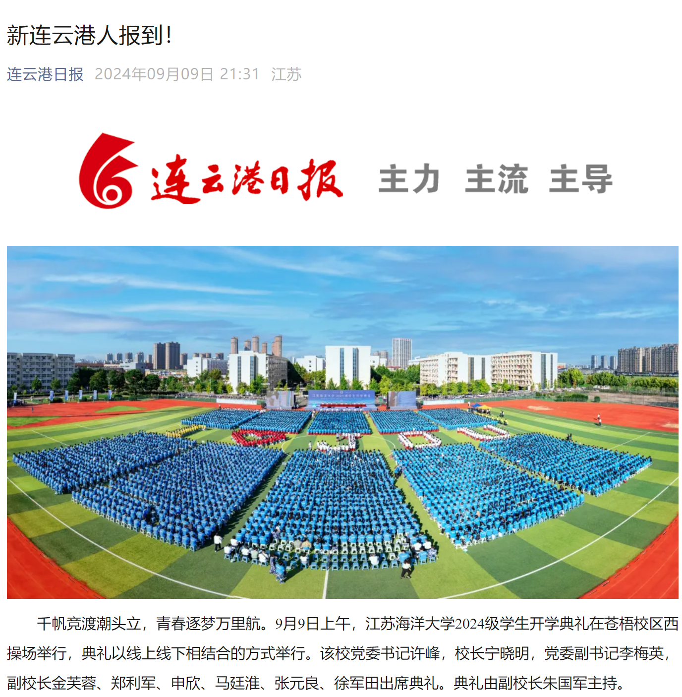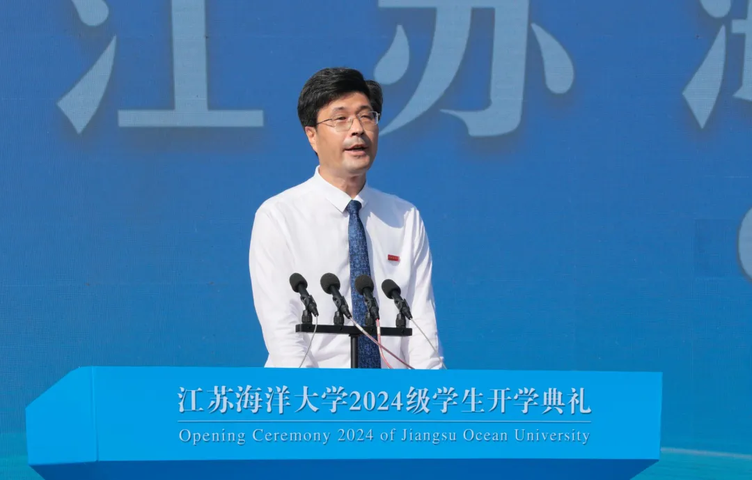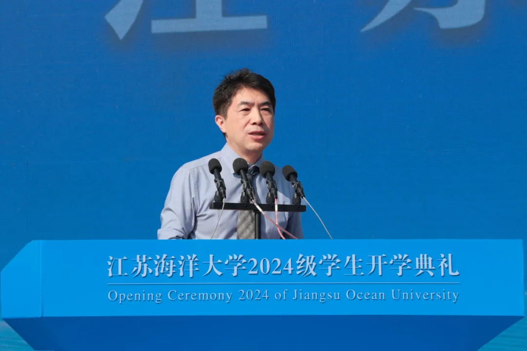千帆竞渡潮头立,青春逐梦万里航。9月9日上午,江苏海洋大学2024级学生开学典礼在苍梧校区西操场举行,典礼以线上线下相结合的方式举行。该校党委书记许峰,校长宁晓明,党委副书记李梅英,副校长金芙蓉、郑利军、申欣、马廷淮、张元良、徐军田出席典礼。典礼由副校长朱国军主持。