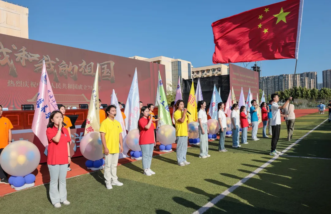 江海大学子身着湛蓝夺目的“海大衫”,满怀欣喜整齐入座。场地中央由身着红白两色T恤的学子摆出“I♥JOU”的图样。校国旗仪仗队队员手持五星红旗、校旗、各学院院旗入场,《我和我的祖国》旋律响起,全场师生齐唱,用嘹亮的歌声歌颂祖国。整个典礼现场在梦想涌动、热情澎湃中幻化成一片蔚蓝的海洋。上午八点,典礼伴随着庄严的国歌声拉开帷幕。