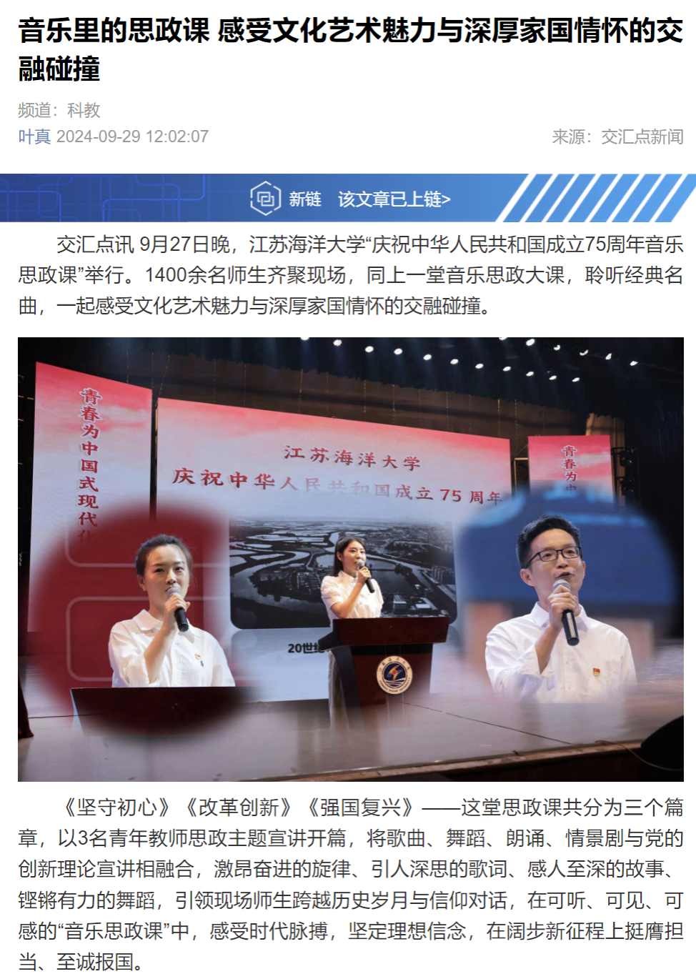 交汇点讯9月27日晚,江苏海洋大学“庆祝中华人民共和国成立75周年音乐思政课”举行。1400余名师生齐聚现场,同上一堂音乐思政大课,聆听经典名曲,一起感受文化艺术魅力与深厚家国情怀的交融碰撞。