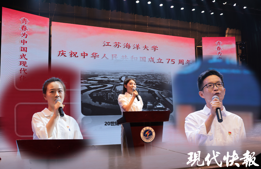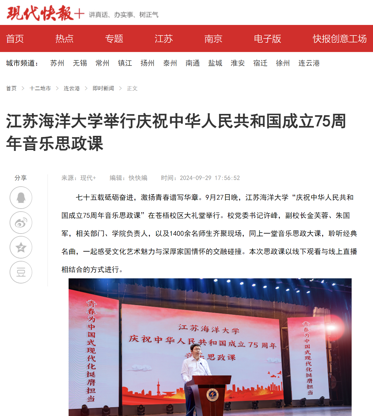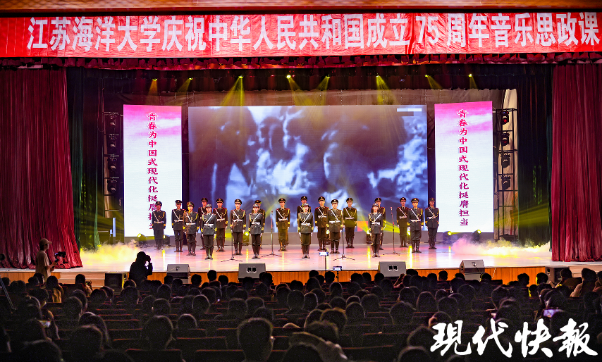 七十五载砥砺奋进,激扬青春谱写华章。9月27日晚,江苏海洋大学“庆祝中华人民共和国成立75周年音乐思政课”在苍梧校区大礼堂举行。校党委书记许峰,副校长金芙蓉、朱国军,相关部门、学院负责人,以及1400余名师生齐聚现场,同上一堂音乐思政大课,聆听经典名曲,一起感受文化艺术魅力与深厚家国情怀的交融碰撞。本次思政课以线下观看与线上直播相结合的方式进行。
