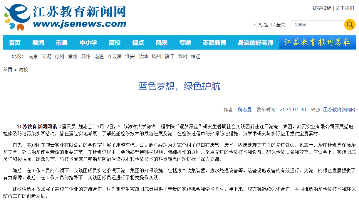 7月22日,江苏海洋大学海洋工程学院“逐梦深蓝”研究生暑期社会实践团前往连云港港口集团、鸿云实业有限公司开展船舶检修及防治污染实践活动,旨在通过实地考察,了解船舶检修技术的最新进展及港口在检修过程中的环保防治措施,为学术研究与实际应用提供宝贵素材。
