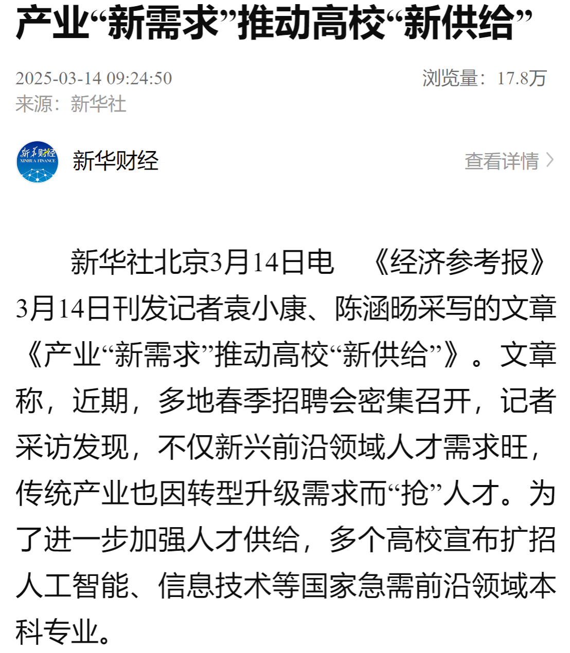 《经济参考报》3月14日刊发记者袁小康、陈涵旸采写的文章《产业“新需求”推动高校“新供给”》。文章称,近期,多地春季招聘会密集召开,记者采访发现,不仅新兴前沿领域人才需求旺,传统产业也因转型升级需求而“抢”人才。为了进一步加强人才供给,多个高校宣布扩招人工智能、信息技术等国家急需前沿领域本科专业。