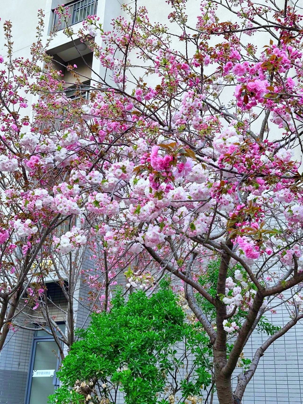 校园里花枝吐艳,粉瓣如霞