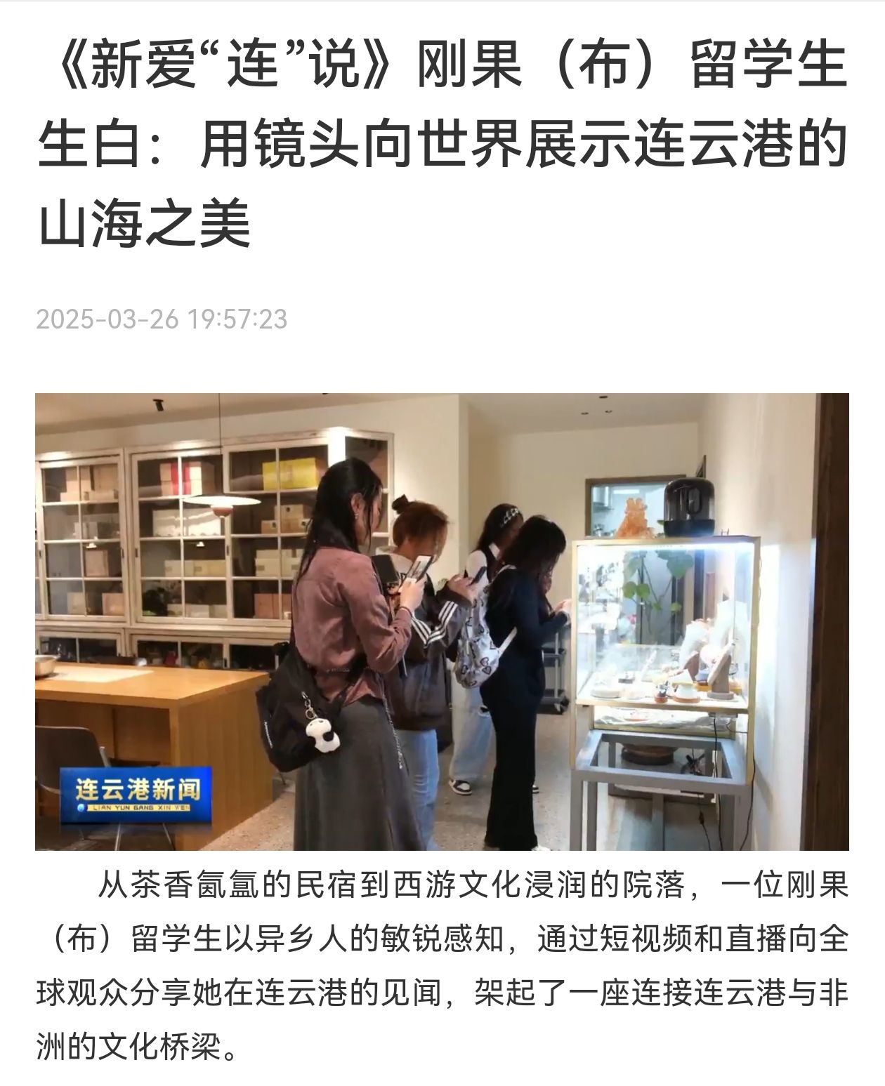 从茶香氤氲的民宿到西游文化浸润的院落,一位刚果(布)留学生以异乡人的敏锐感知,通过短视频和直播向全球观众分享她在连云港的见闻,架起了一座连接连云港与非洲的文化桥梁。