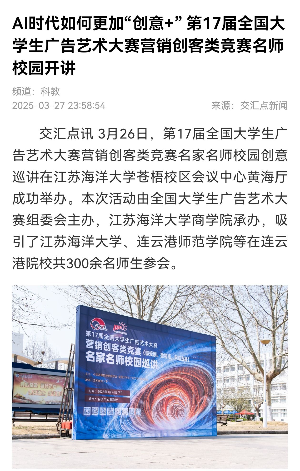 3月26日,第17届全国大学生广告艺术大赛营销创客类竞赛名家名师校园创意巡讲在江苏海洋大学苍梧校区会议中心黄海厅成功举办。本次活动由全国大学生广告艺术大赛组委会主办,江苏海洋大学商学院承办,吸引了江苏海洋大学、连云港师范学院等在连云港院校共300余名师生参会。