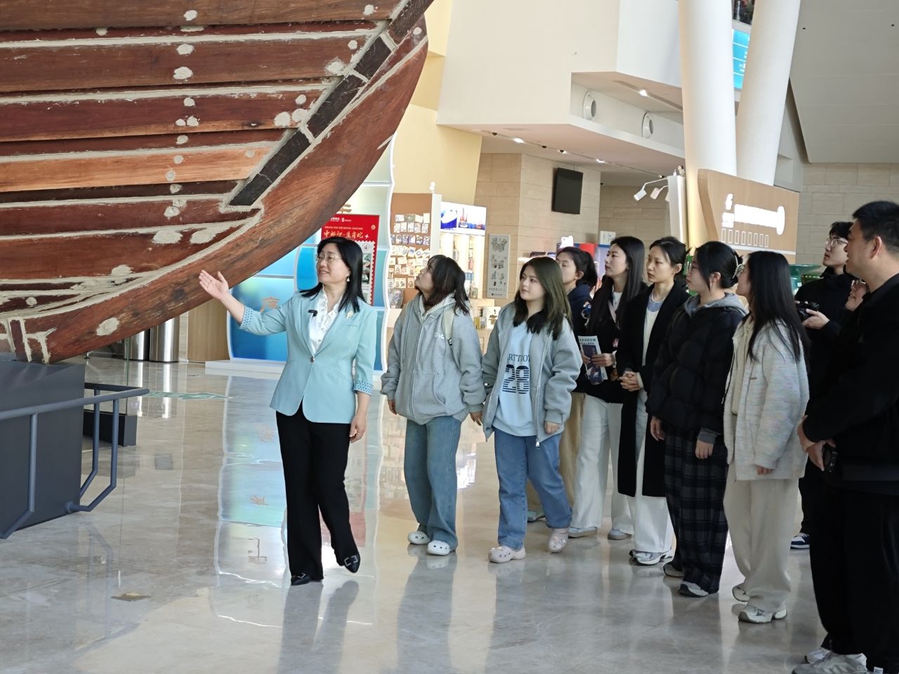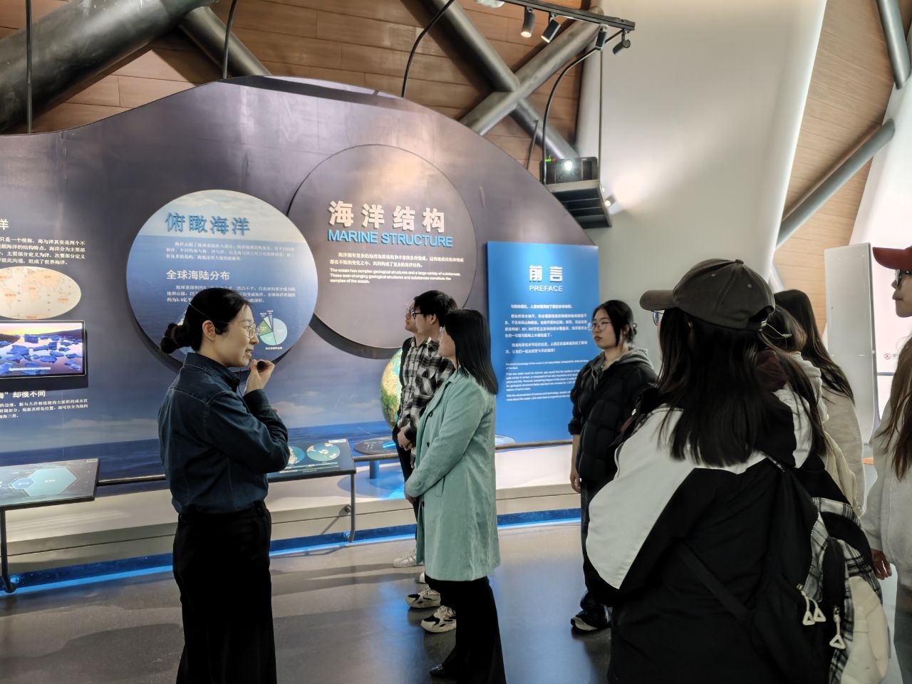 4月1日,江苏海洋大学跨学科研究团队“深蓝‘工’略”成员——来自海洋工程学院、艺术设计学院的近30名师生,一同走进天津·国家海洋博物馆(以下简称“海博馆”)研学,了解海工装备智能制造技术革新历程,寻找海洋文创产品研发灵感,探讨“AI+艺术”赋能工科专业课程思政建设的新途径。专业教师张会霞、王栋和海博馆研究员王玉共同为同学们上了一堂别开生面的“海博馆里的思政课”。