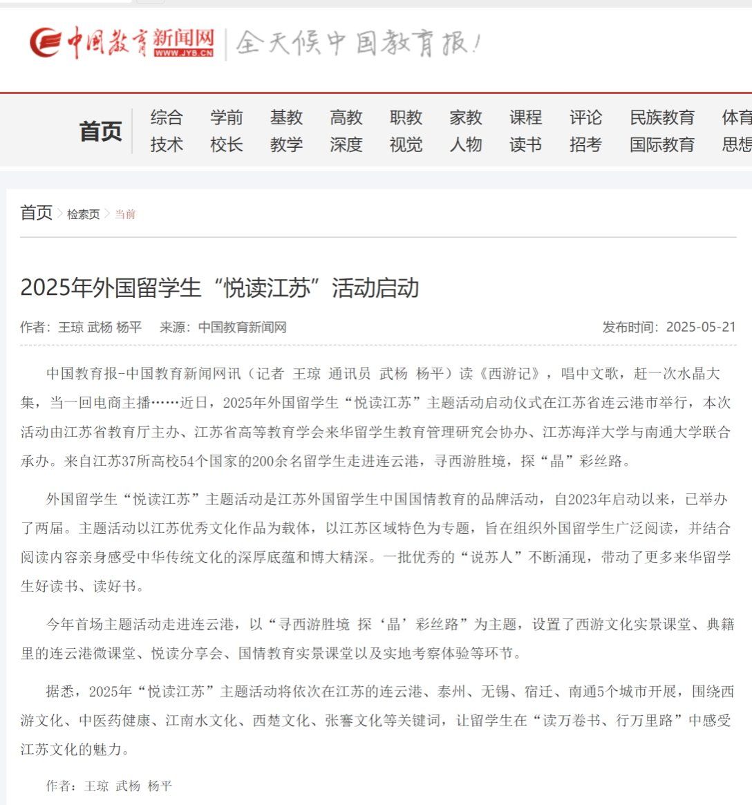 据悉,2025年“悦读江苏”主题活动将依次在江苏的连云港、泰州、无锡、宿迁、南通5个城市开展,围绕西游文化、中医药健康、江南水文化、西楚文化、张謇文化等关键词,让留学生在“读万卷书、行万里路”中感受江苏文化的魅力。