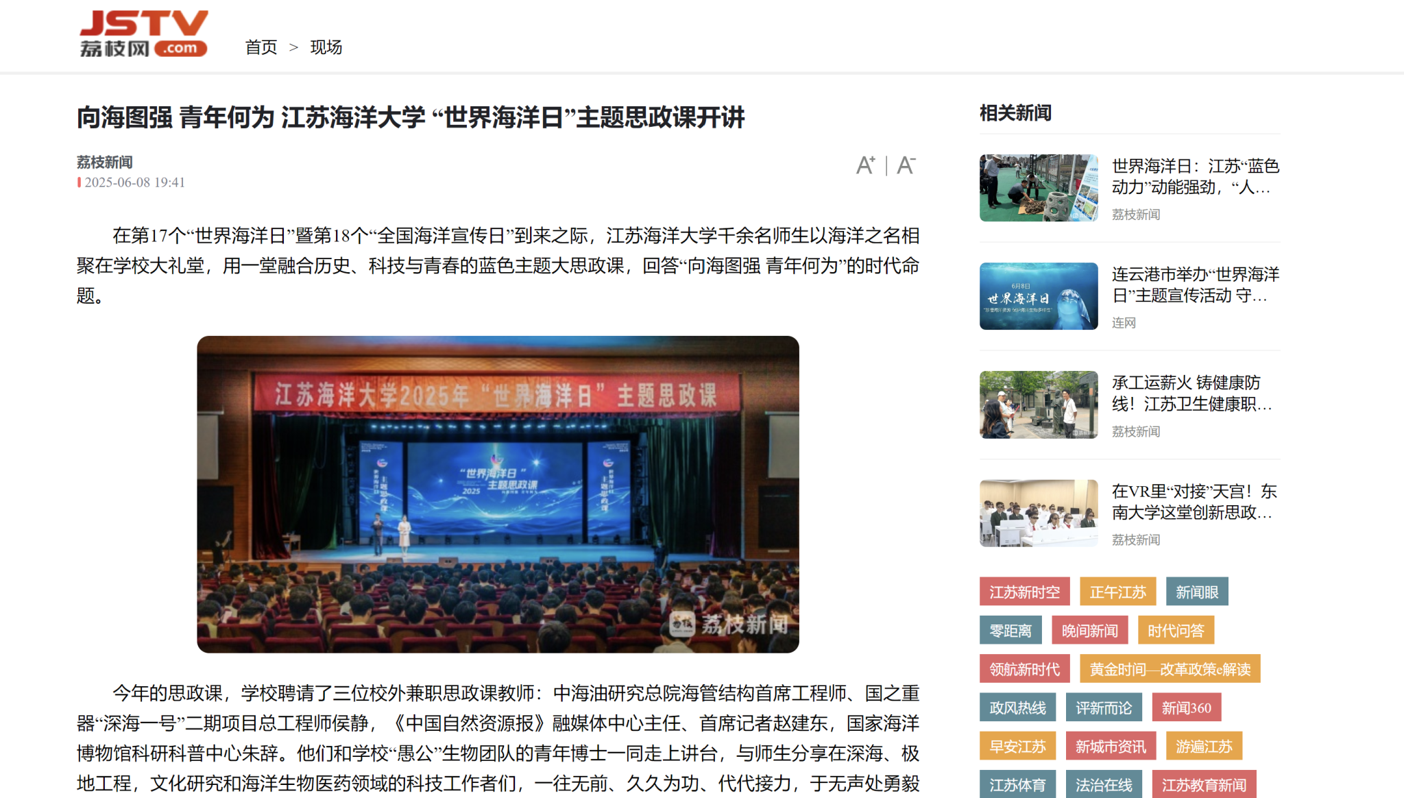 在第17个“世界海洋日”暨第18个“全国海洋宣传日”到来之际,江苏海洋大学千余名师生以海洋之名相聚在学校大礼堂,用一堂融合历史、科技与青春的蓝色主题大思政课,回答“向海图强 青年何为”的时代命题。