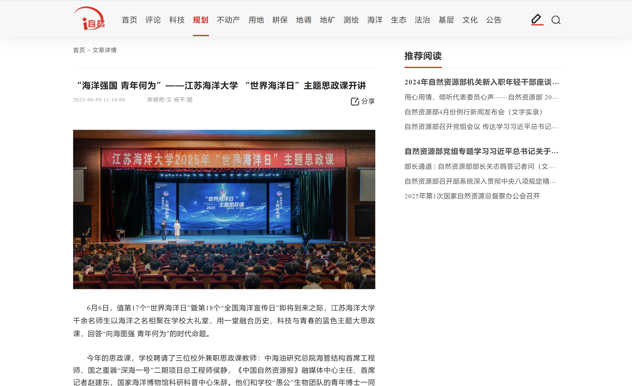 据悉,江苏海洋大学每年在“世界海洋日”暨“全国海洋宣传日”期间,都会举办以爱国主义教育为目的,强化海洋意识教育为主题的“蓝色”大思政课,思政课由校党委宣传部策划,得到了自然资源部宣传教育中心、中国大洋学会、中国海洋学会、国家海洋博物馆,以及深海、深地工程相关科研院所和科学家们的大力支持,逐渐成为全校师生共同期盼、热情参与、海洋特色鲜明的“蓝色”名片。