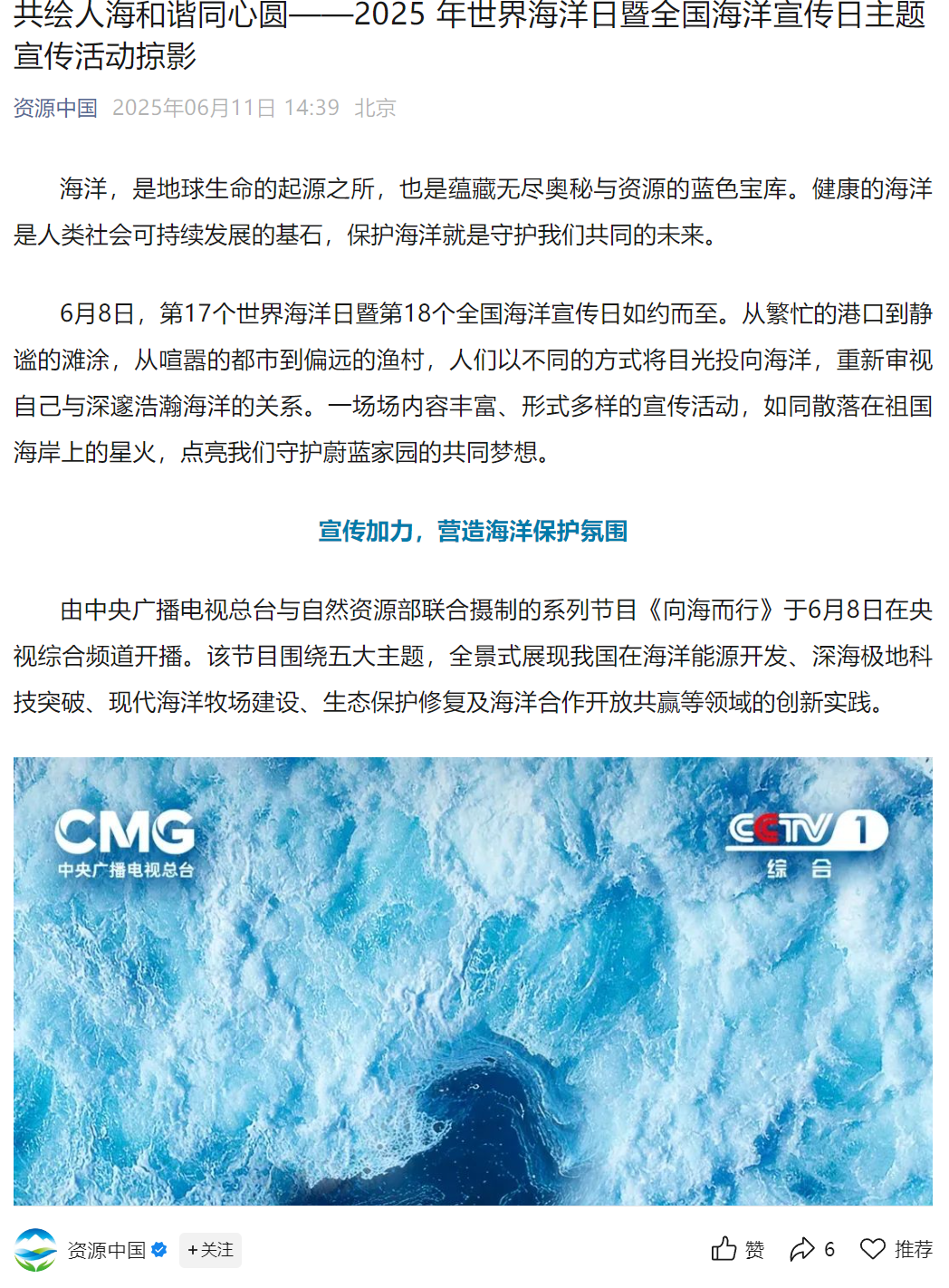 中国自然资源报社与“学习强国”学习平台联合推出“2025年世界海洋日暨全国海洋宣传日”专题,同步在大自然频道和推荐频道上线。截至6月9日13时,专题总阅读量达4550万人次。自然资源部官方微博运维“全国海洋宣传日”话题,新增阅读量约50万人次;自然资源部官方微信“海洋日作品展播”栏目面向自然资源宣传矩阵单位征集新媒体作品并择优展播。报社“i自然全媒体”第三方平台账号发布海洋日相关内容,总阅读量达174.7万。“i自然”移动客户端和“i自然”网站设立“海洋宣传日”专题,聚焦主场活动,集合地方和自然资源系统单位活动开展情况,共发布文字、图片、视频80多篇(件)。