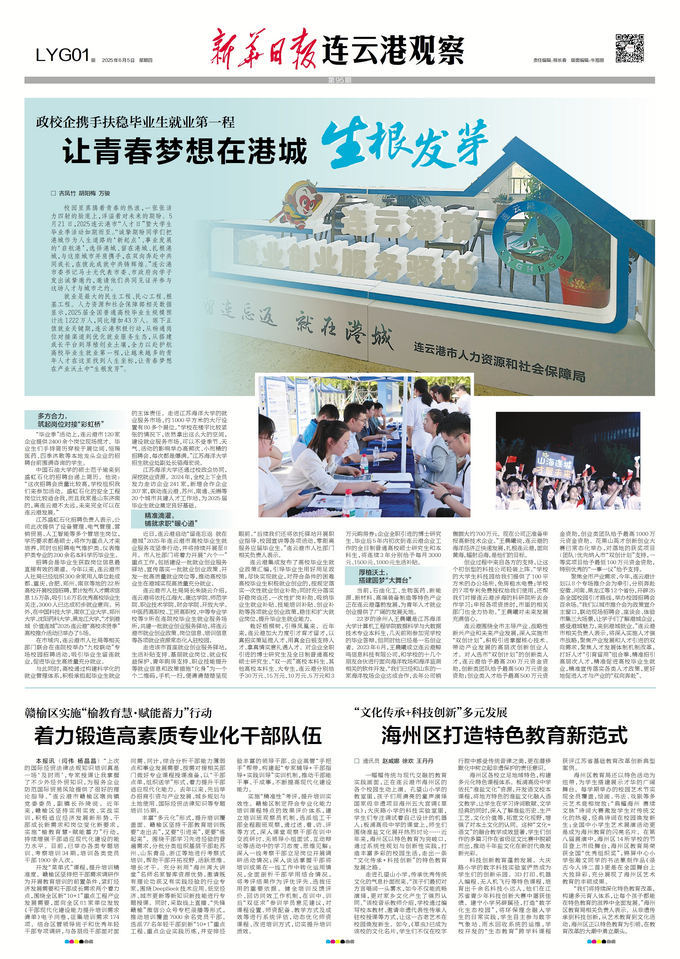 就业是最大的民生工程、民心工程、根基工程。人力资源和社会保障部相关数据显示,2025届全国普通高校毕业生规模预计达1222万人,同比增加43万人。眼下正值就业关键期,连云港积极行动,从畅通岗位对接渠道到优化就业服务生态,从搭建成长平台到厚植创业土壤,全力以赴护航高校毕业生就业第一程,让越来越多的青年人才在这里找到人生坐标,让青春梦想在产业沃土中“生根发芽”。